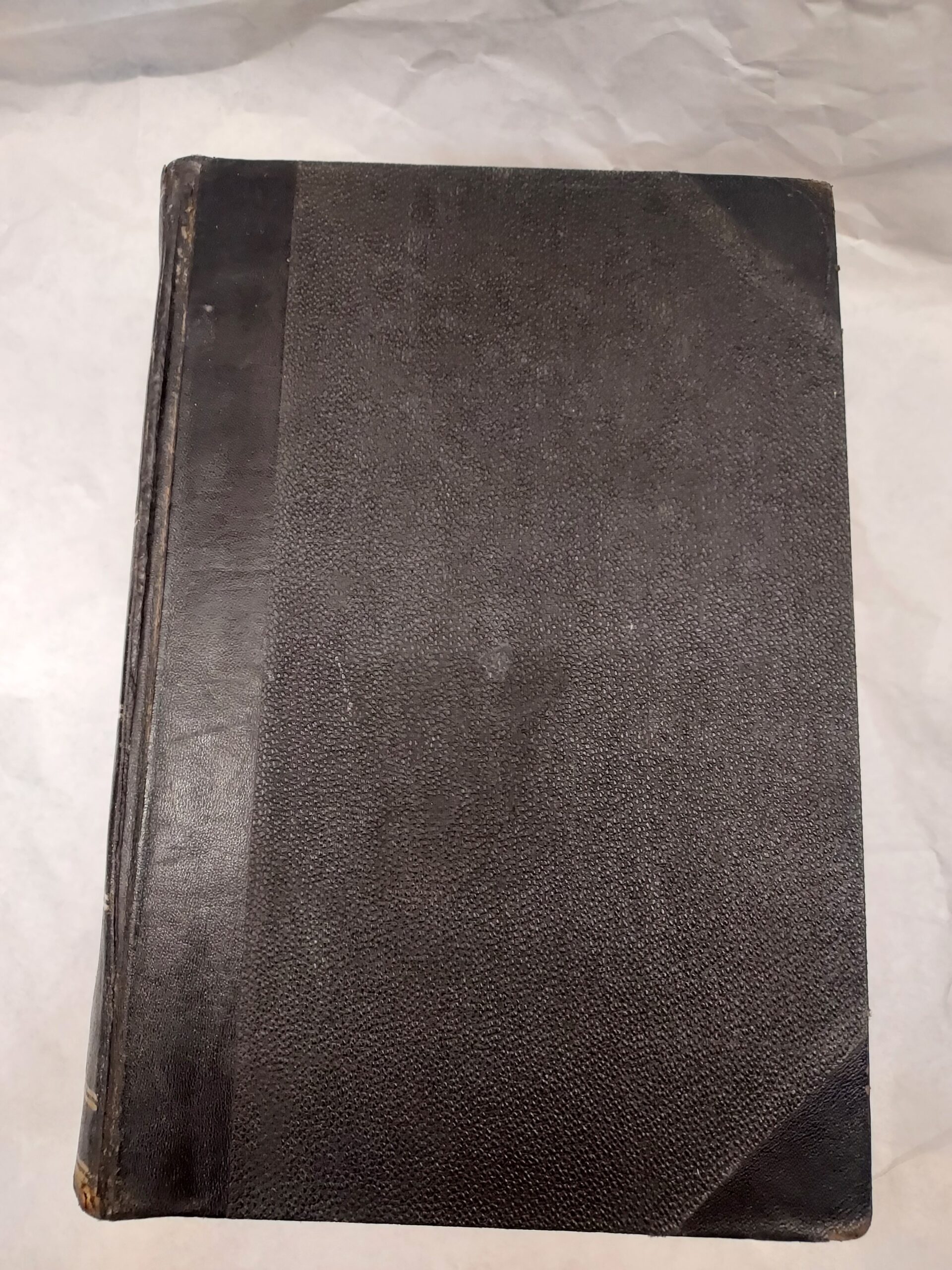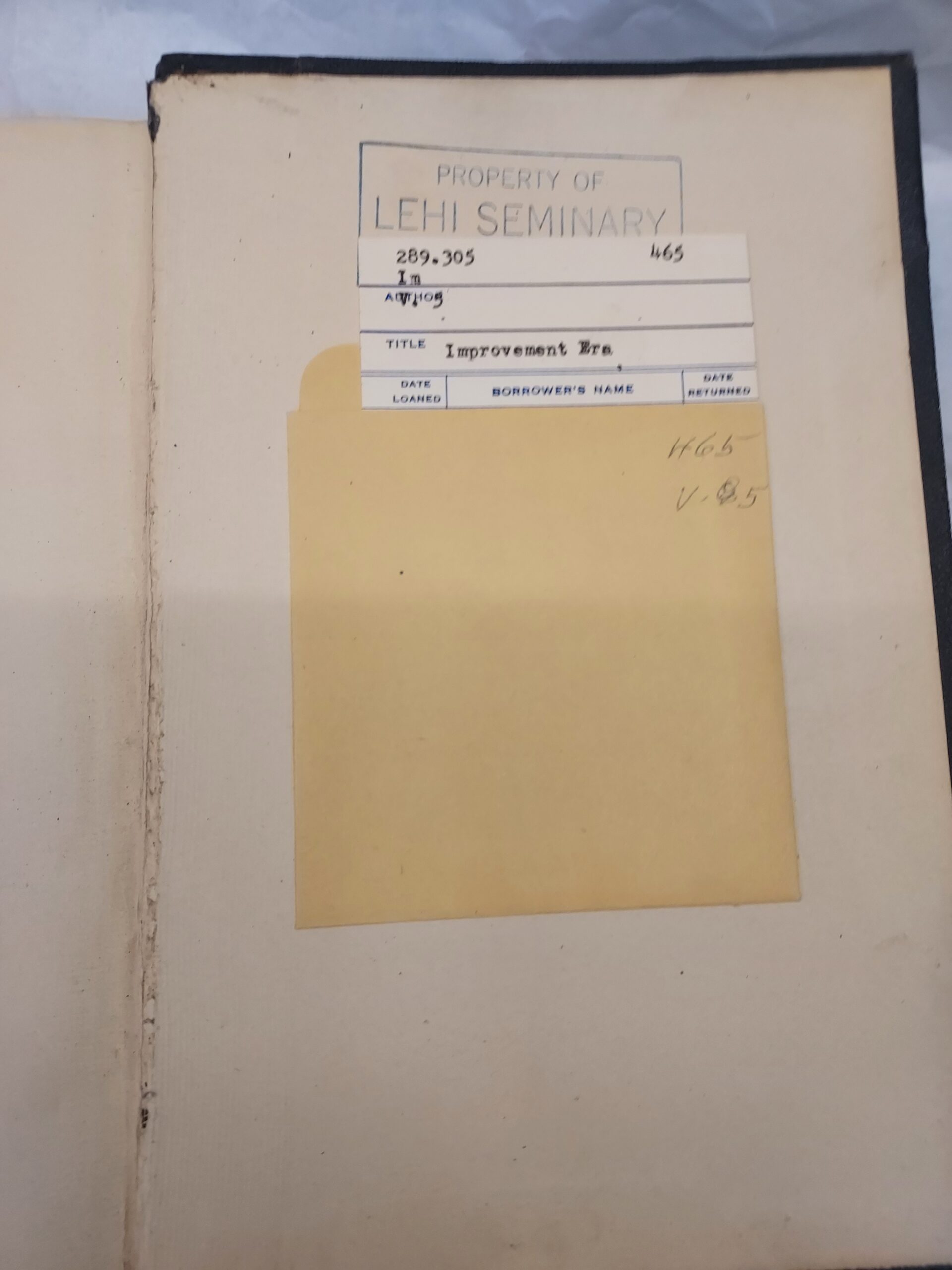 Scrapes/smudges to front and back covers, wear to edges/corners. Library code written on bottom of spine. Some tearing on top and bottom of spine, on edges and on spine proper. Wear and scrapes inside front and back covers were stickers were removed. Still has library slip with punch card in back cover from Lehi Seminary. Wear along spine inside covers, but binding is still strong. Markings on first fly leaf but otherwise pages are clear of markings. A few bent pages.