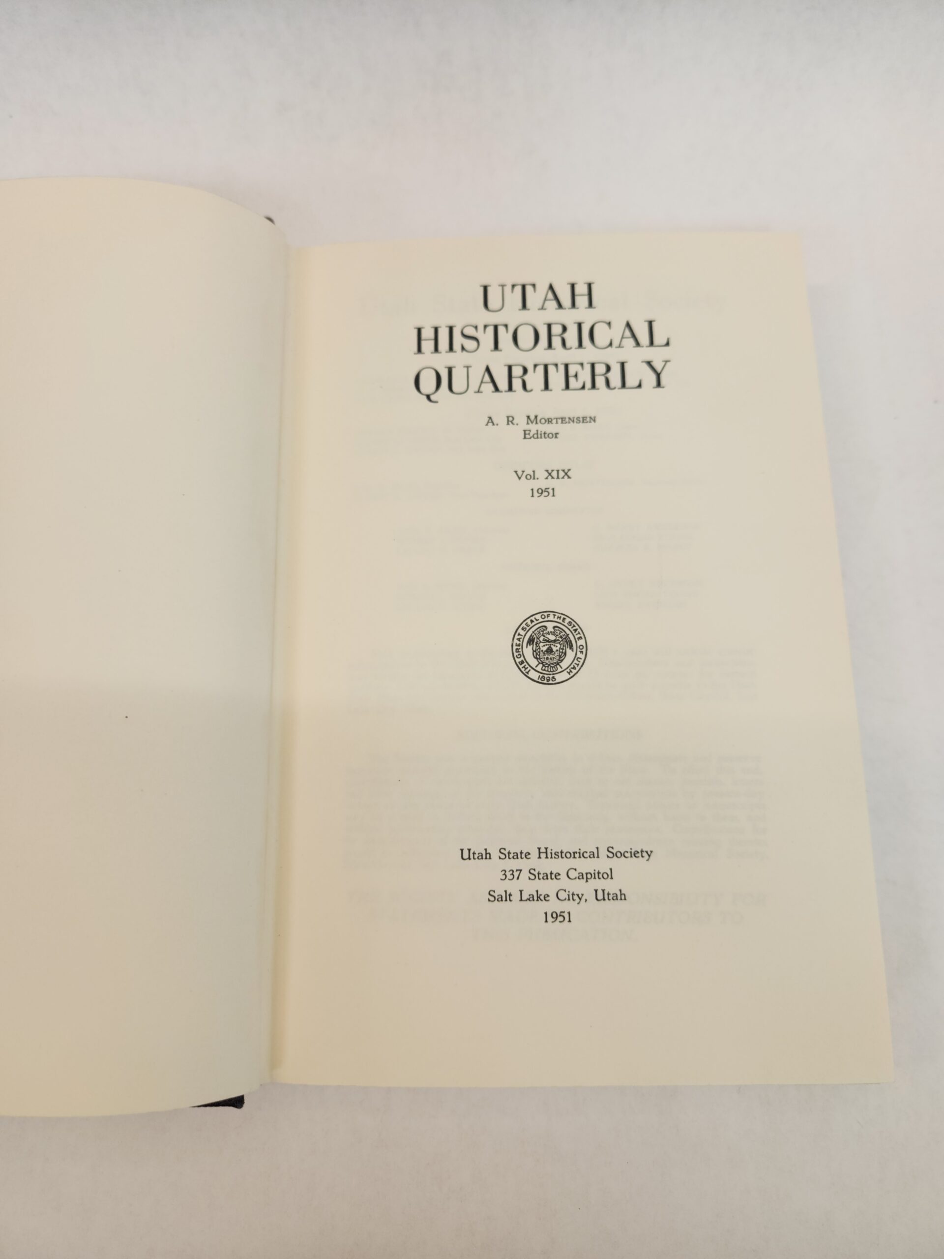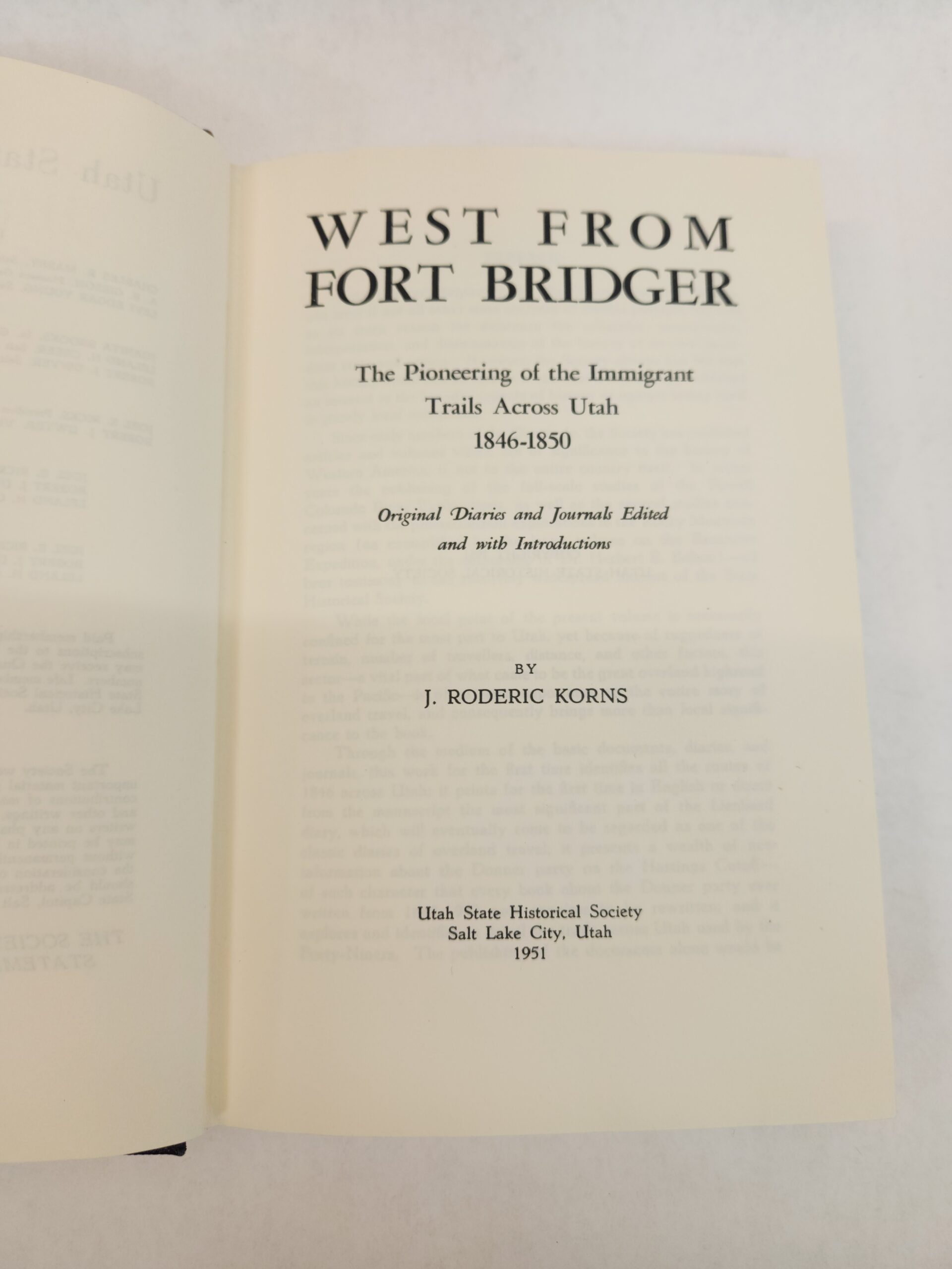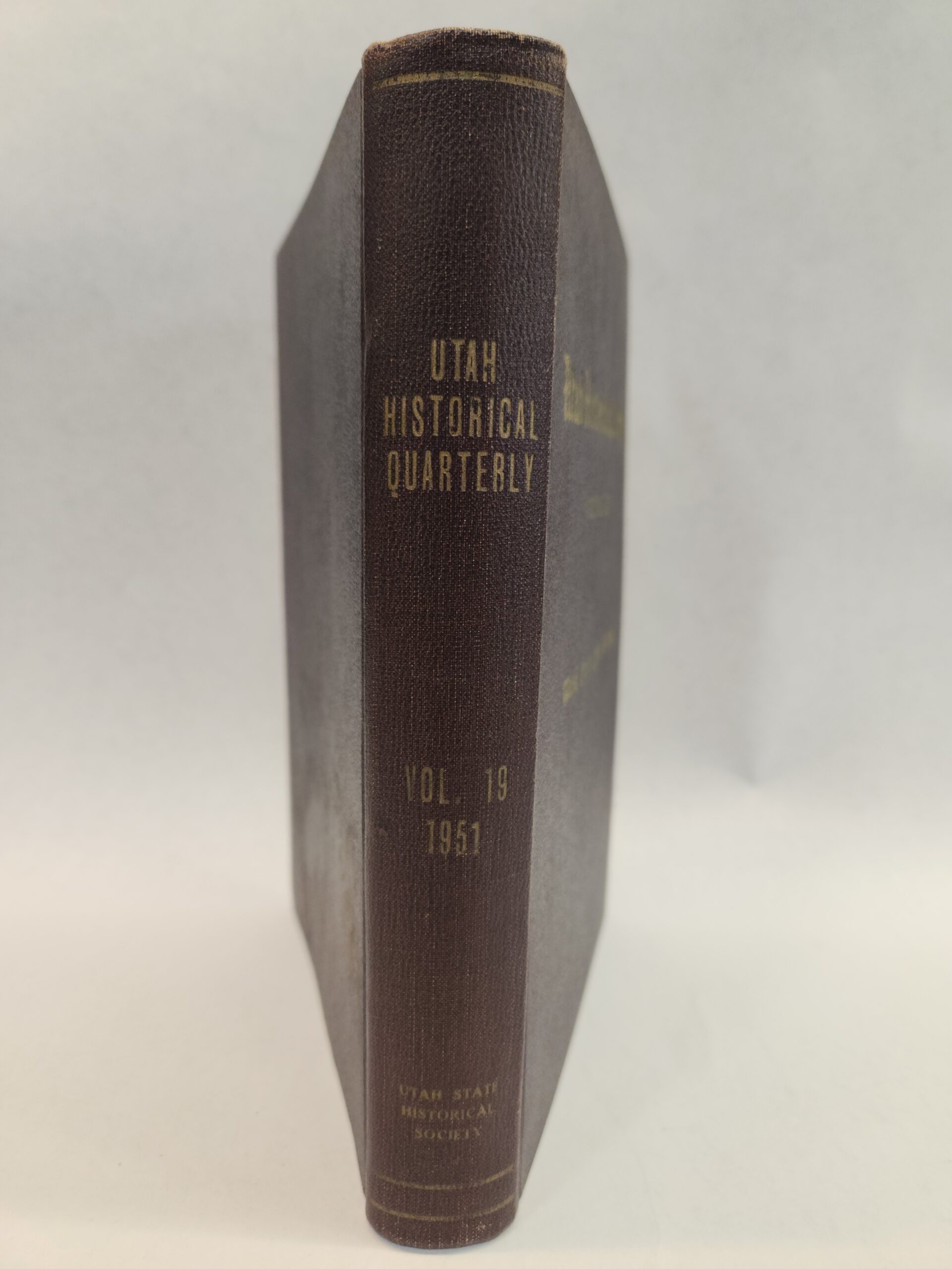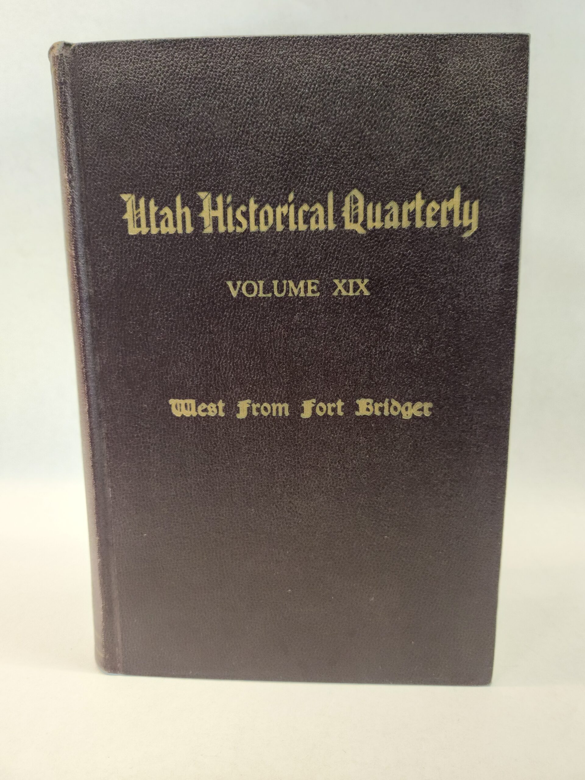 The Historical Quarterly:: Volume XIX, West From Fort Bridger (Hardcover, Faux Leather, 1951) Corner and edges show some shelf wear with rub marks and dings/dents. Back cover is dirty with several smudge marks (see pic in gallery). Binding is okay. Two maps included. The Utah map has some wrinkling marks in center.