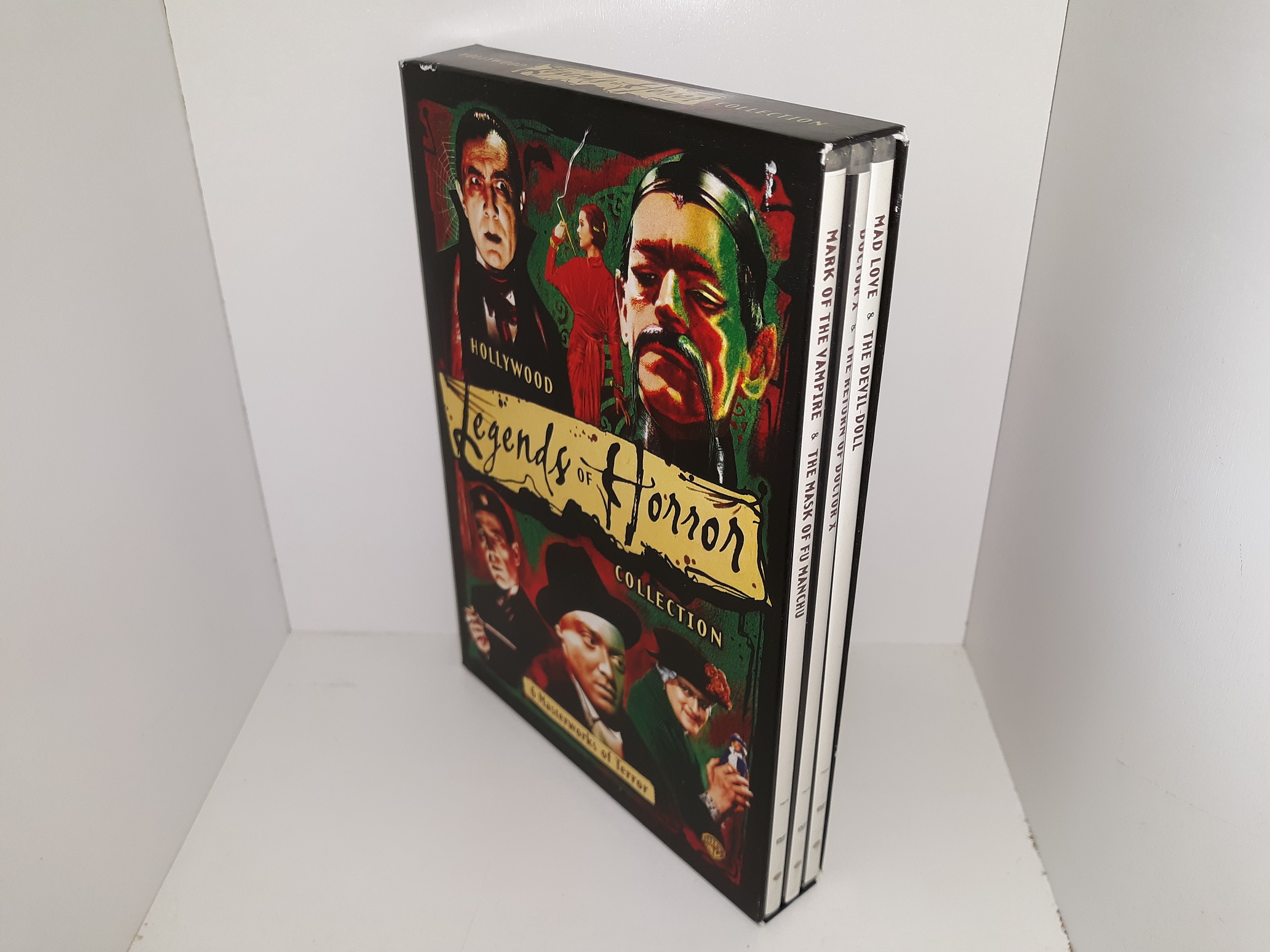 3 good condition DVDs kept within a slip-case. The slip-case has some tears, scuffing, and a price sticker. The DVD cases have no visible wear. The DVDs have no visible wear or marks.