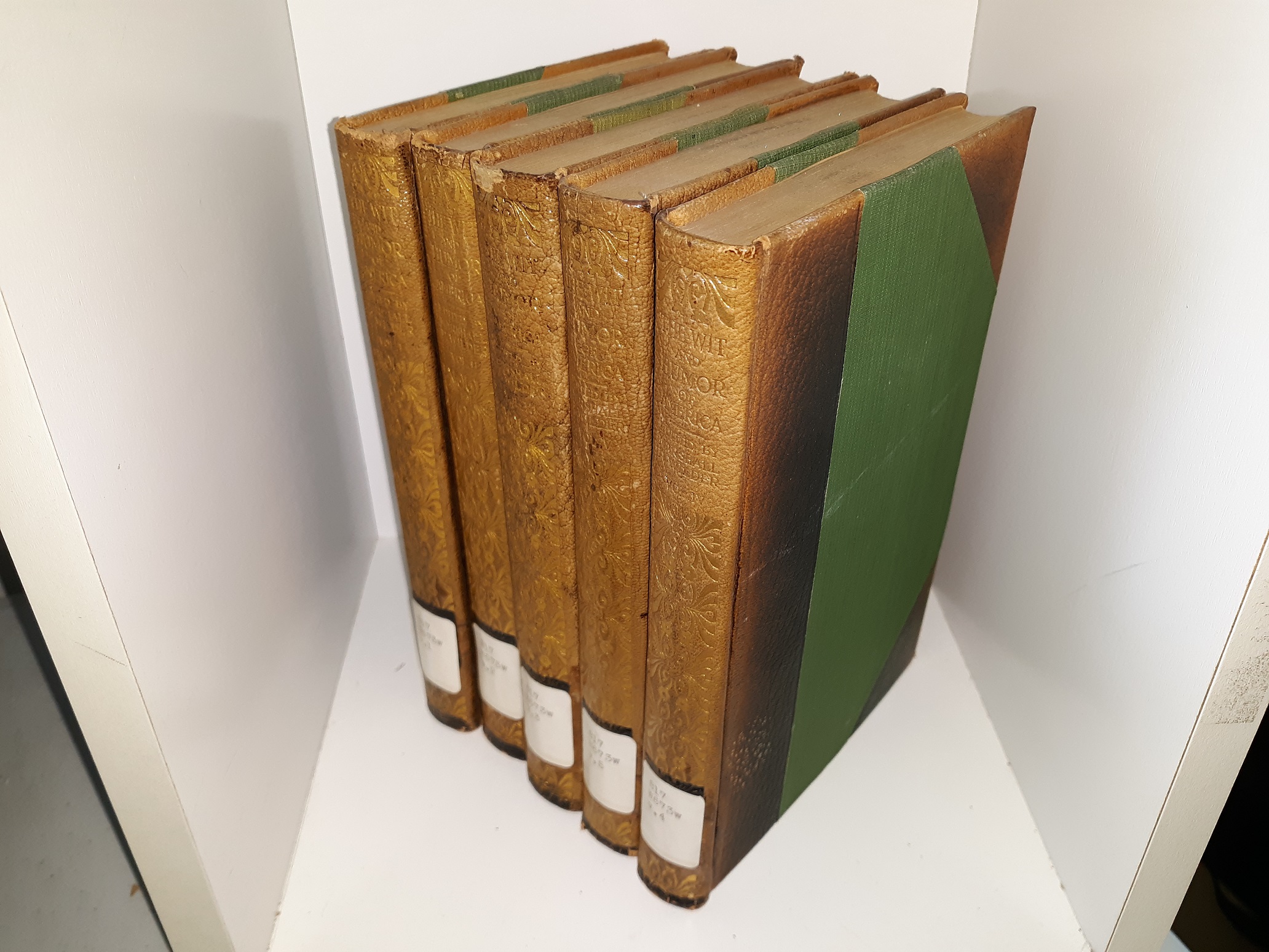 5 fair condition, 3/4 leather, ex-library hardcovers with no dust jackets. The covers have some pieces torn off, tears, scratches, scuffing, fraying, discoloration, and the spines have ex-library stickers, and marker marks. The page edges have ink stamps, small tears, some stains, or creases. Some pages have ex-library ink stamps, stickers, or adhesive residue. The flyleaves have some writing in pencil and eraser marks.