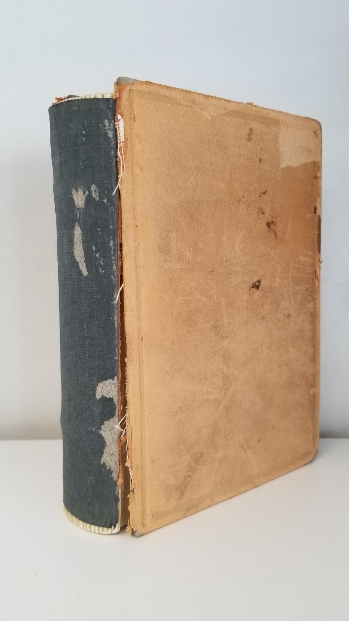 1907; smaller size suede leather binding; thick; over 600 pages; boards are present but leather on spine is all missing; boards are loose; text is quite good and clean; slight library stamping inside and at bottom of title page but text block is quite nice.