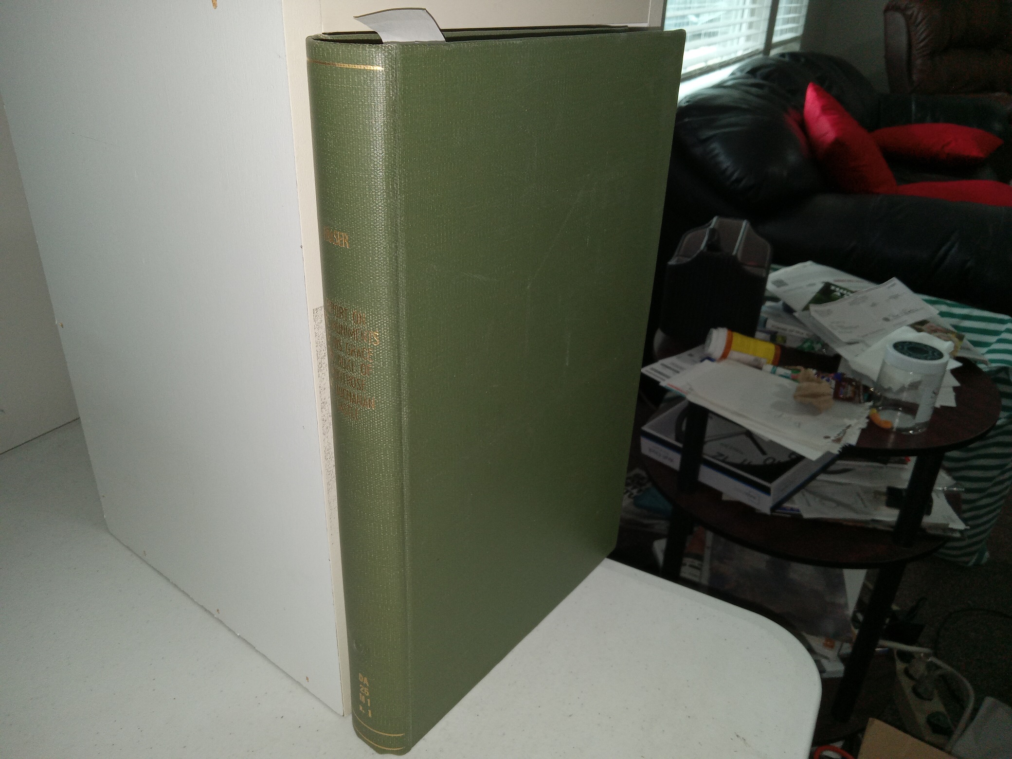 Fair condition, large, green hardcover with no dust jacket. The cover has some stains, and some minor scuffing. Some pages have ink stamps on the edges, pencil marks, or stains, but the text throughout is clear and legible. The back inside cover has an ex-library catalog card pouch, and an ex-library sticker. The back flyleaf has a large, ex-library “Date Due” sticker, and some wrinkling.