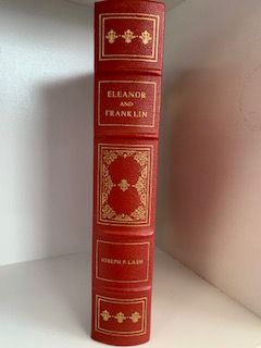 Red leather hardbound with gold art, great condition, with a gold bookmark and gold-lined pages. There is a white mark on the back cover.