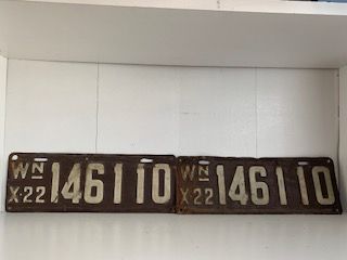 Front and back Brown license plates. There are some scuff marks on the numbers. There are a couple of bends on both plates.