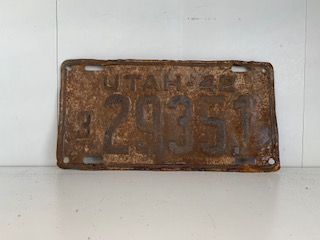 This is a rusted 1940 Utah License plate. The plate is Warped slightly. The lettering is difficult to see because of the rust.