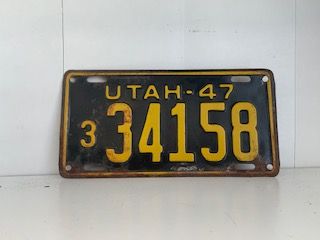 This is a black and yellow 1947 Utah License plate. The plate has some rust (as pictured). There are some scuff marks on the numbers. The numbers are yellow and have some scuff marks.
