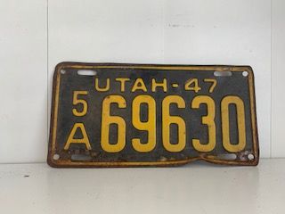 This is a black and yellow 1947 Utah License plate. The plate has some rust (as pictured). There are some scuff marks on the numbers. The numbers are yellow and have some scuff marks.