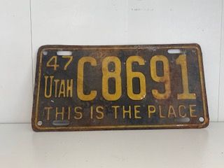 This is a black and yellow 1947 license plate. There is a lot of rust on the plate. The lettering is very visible even through the rust. The plate is in great condition. There are a few white marks on the plate.