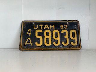 This is a black and yellow 1953 Utah License plate. The plate has some rust (as pictured). There are some scuff marks on the numbers. The numbers are yellow and have some scuff marks.