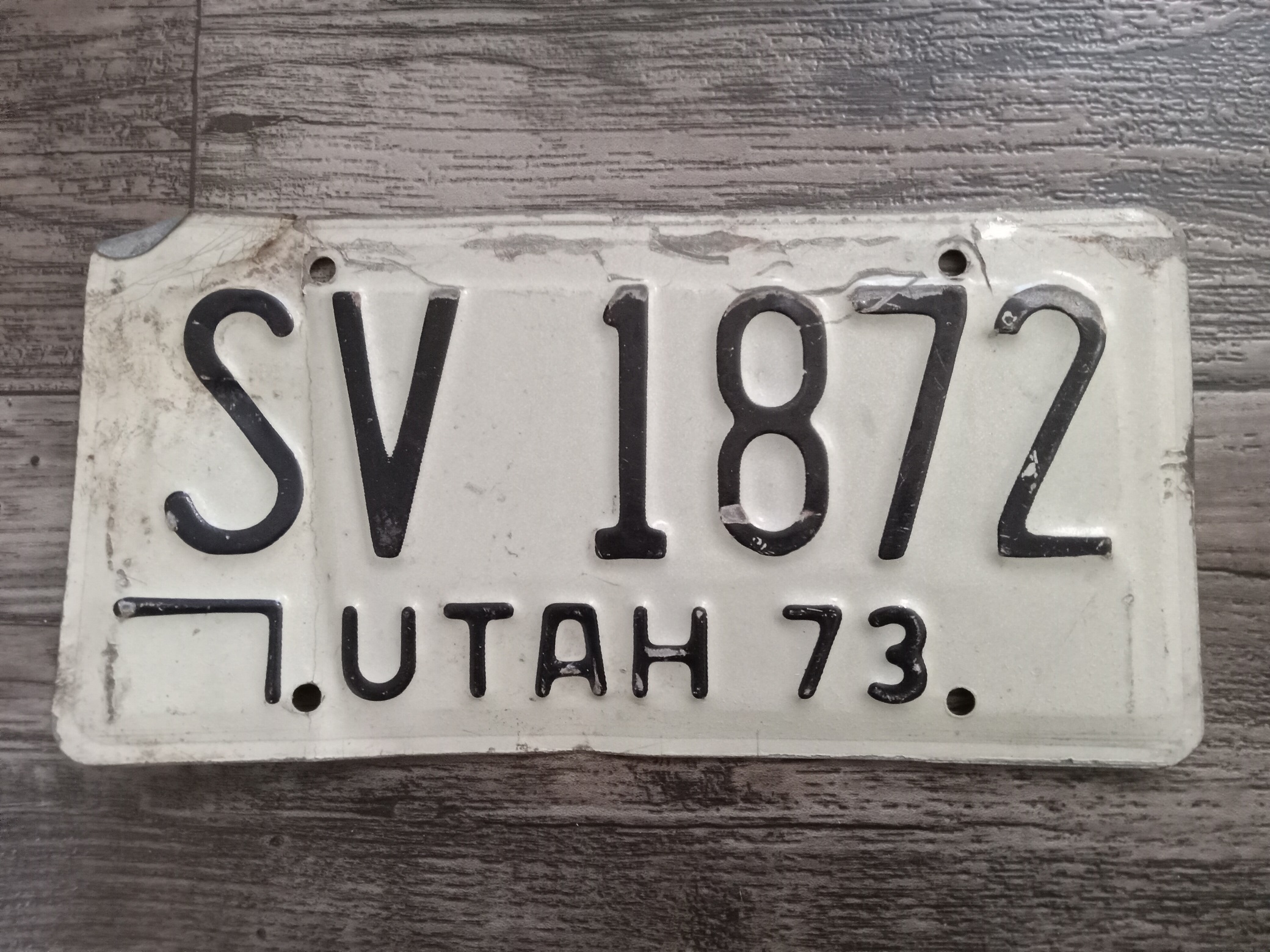 Fair condition, license plate. The plate has scuffing, scratches, warping, some stains, bent corners, and residue.