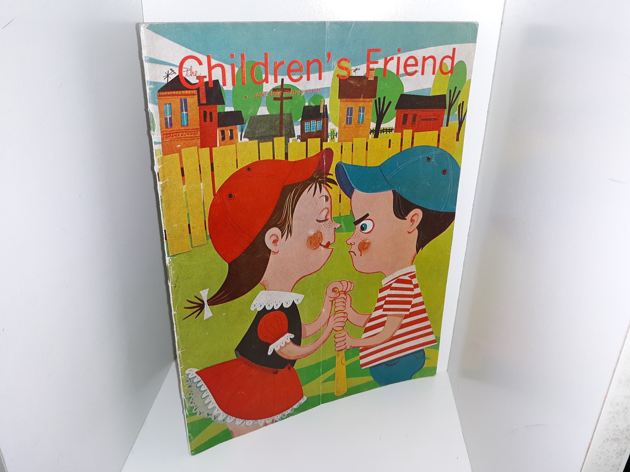 Fair condition, thin, staple-bound magazine. The cover has heavy scuffing, fading, wrinkles, and a smudged mailing stamp on the back. The first page has writing in pencil. Some pages have ink bleeding or a long crease down the middle. Pages 27-28 have a long cut from scissors, and coloring from crayons.