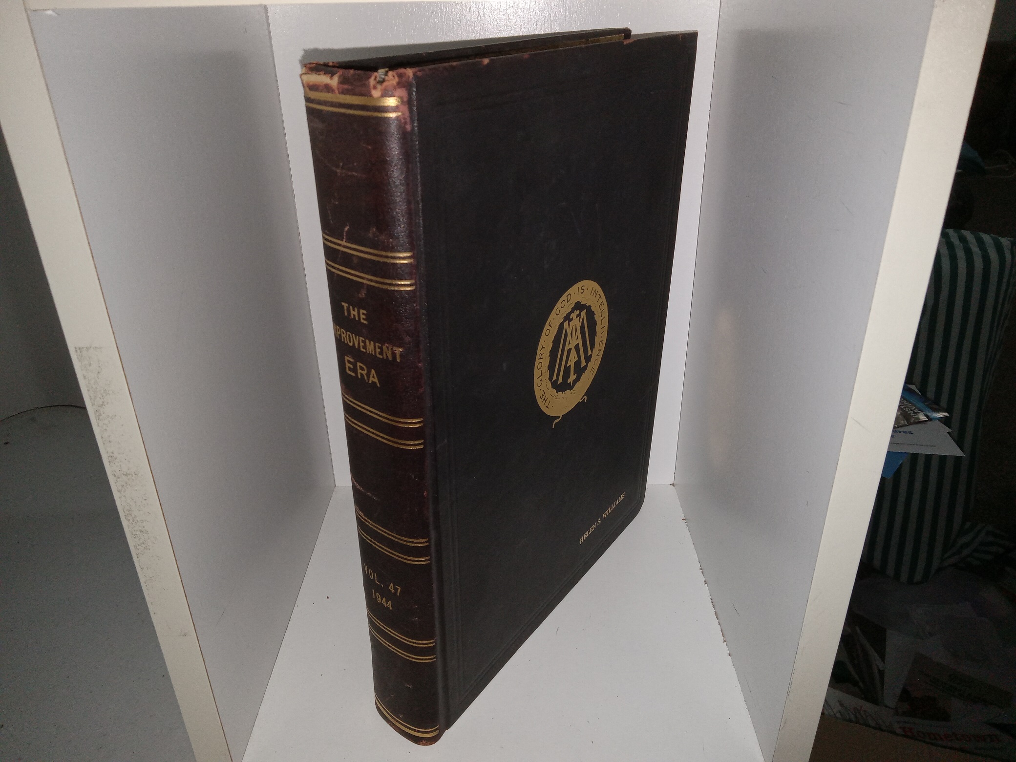 Fair condition, large, black leather-bound book. The cover has the scuff marks, residue, minor peeling along the edges, and the name of a previous owner engraved on the front. Some pages have yellowing, or tiny stains. The title page has writing in pencil, and eraser marks. Text and illustrations throughout are clear and legible.