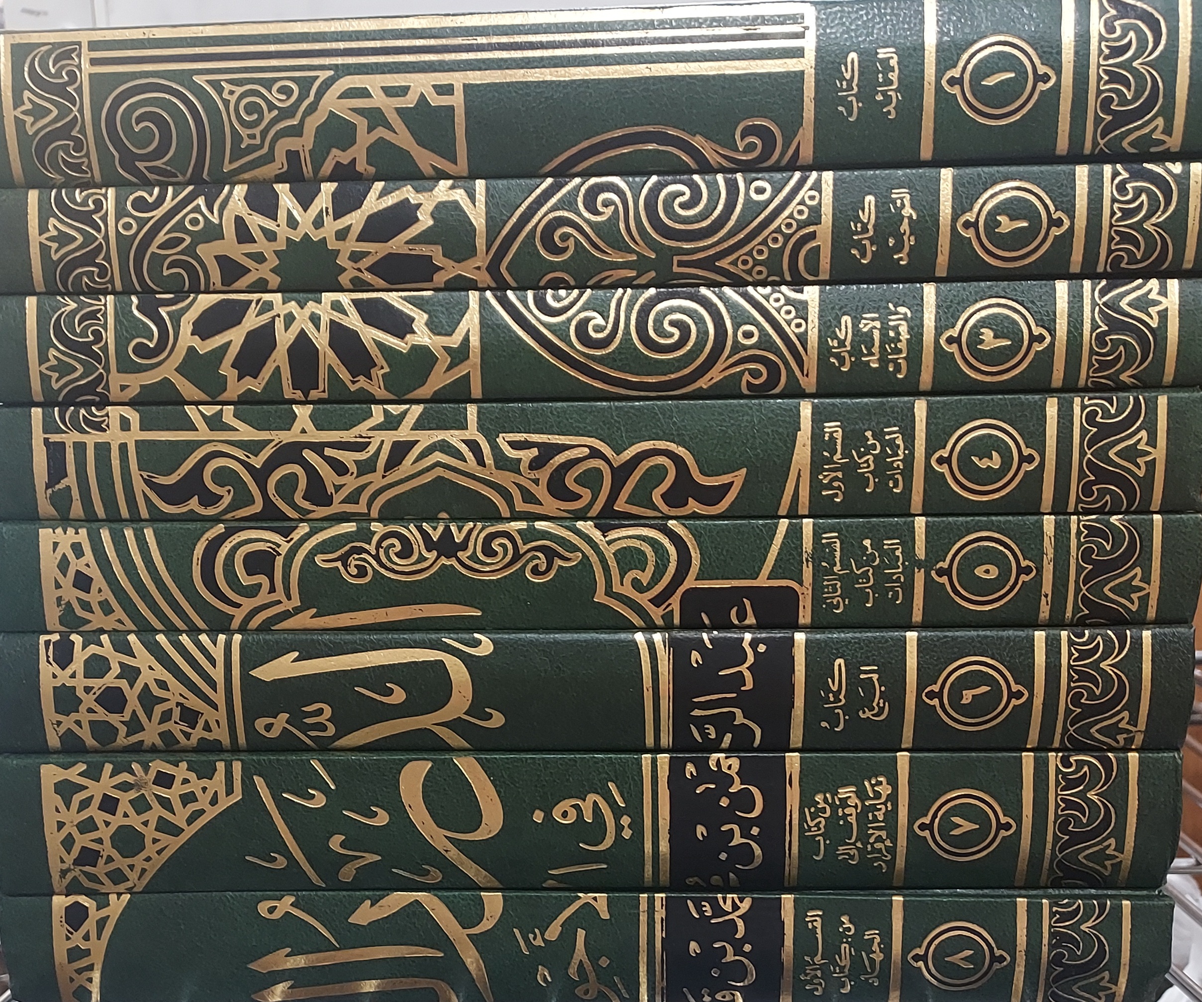 Set is in good condition with little to no wear, and no markings. Included in the set are the following volumes, in order (translated to best of ability): 1. The Book of Beliefs 2. The Book of Monotheism 3. The Book of the Names and Attributes of Allah 4. The Book of Worship part1 5. The Book of Worship part2 6. The Sales Book 7. The Book of Endowment 8. The Book of Jihad