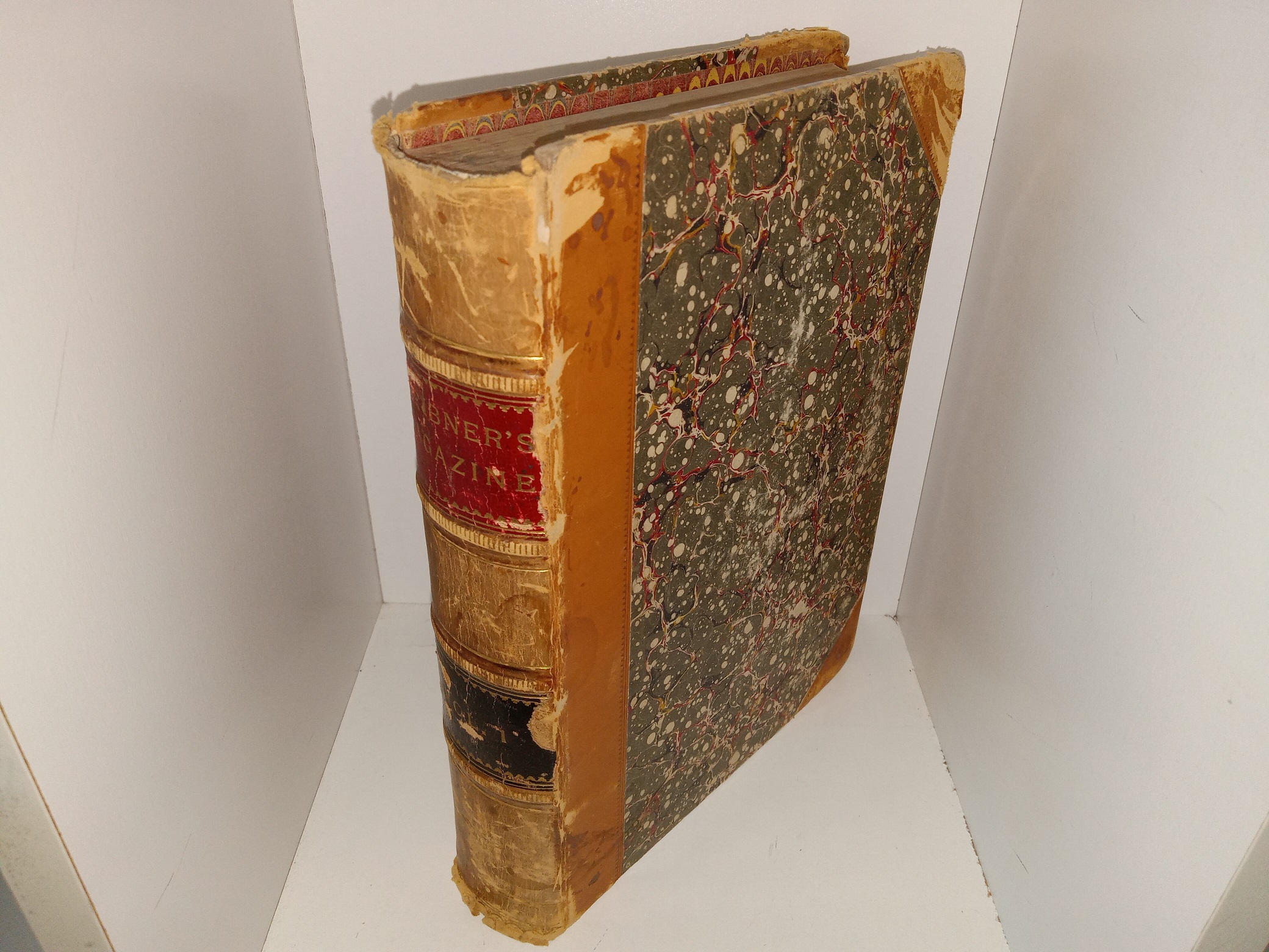 Fair condition, 3/4 leather hardcover with a brown spine. The cover has stains, scuffing, tears, pieces torn off, fraying, scratches, and bent corners and edges. The internal binding is torn, causing some pages to be partially detached from the binding. The front flyleaf has a large sticker. The flyleaves have some faint stains, and writing in pencil.
