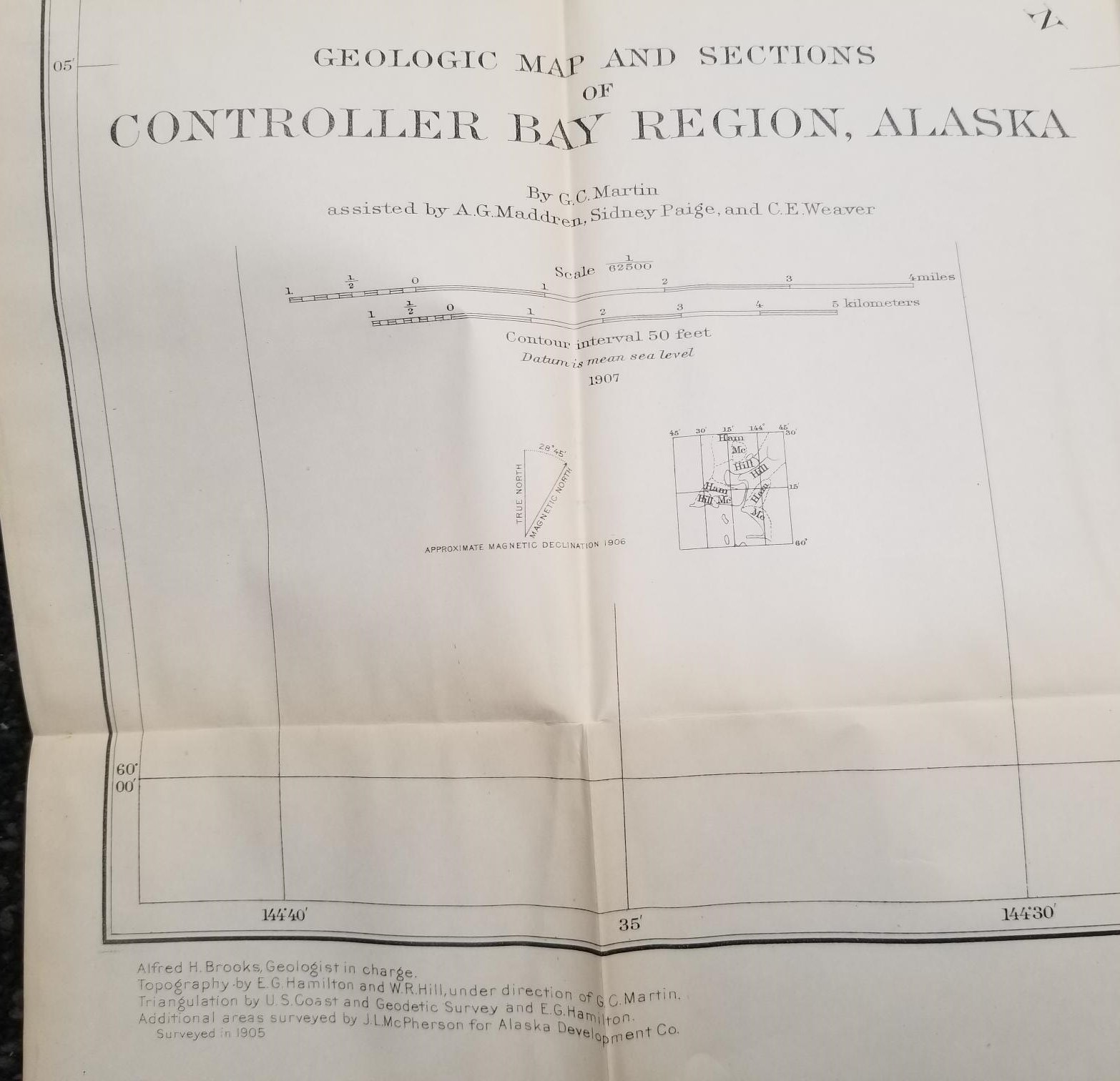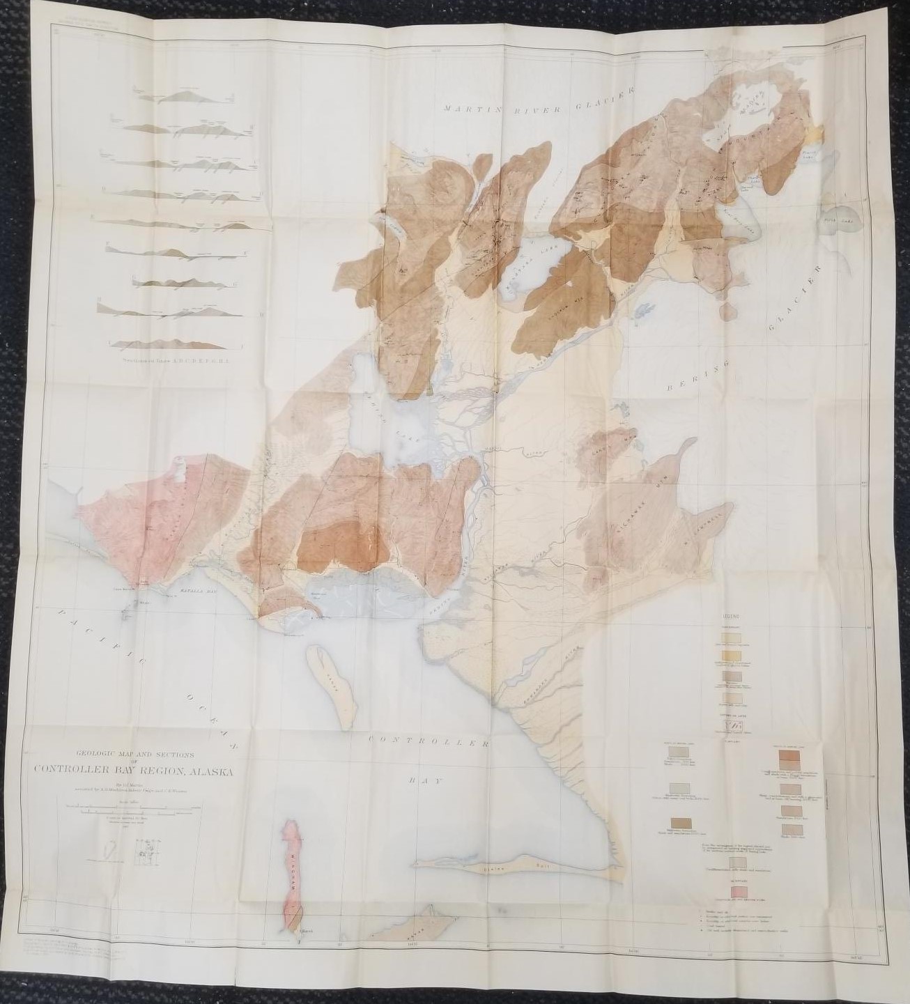 1907 — Large “Geological Map and Sections of Controller Bay Region, Alaska — 3′ Wide x 3′ Tall