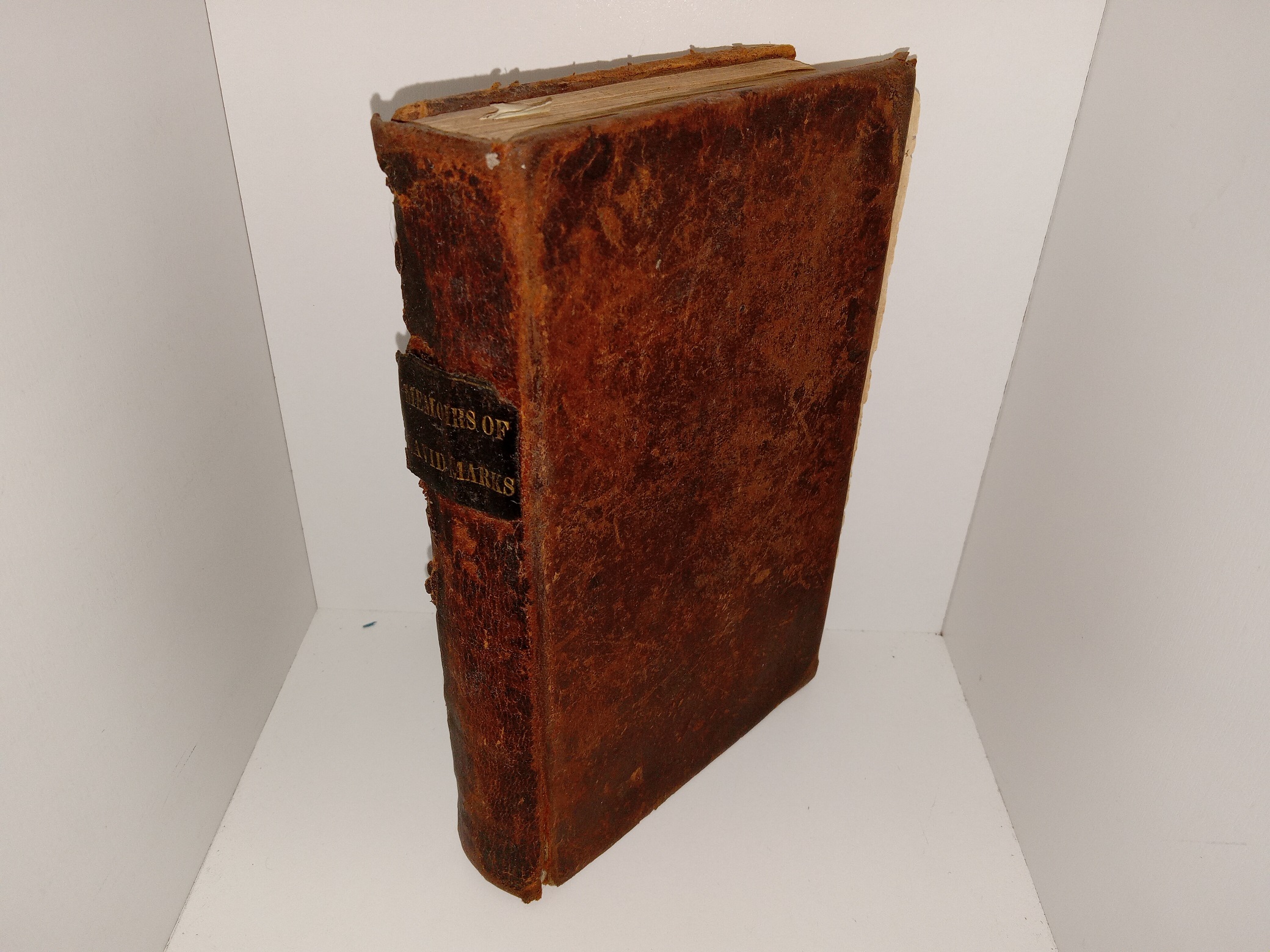Fair condition, brown hardcover with no dust jacket. The cover has heavy scuffing, some tears, peeling, some pieces torn off, and some fraying. The title page is missing. The internal binding is torn. The pages have stains, small pieces torn off, creases, tears, or wrinkling. The first page has writing in pen, pencil, and eraser marks.