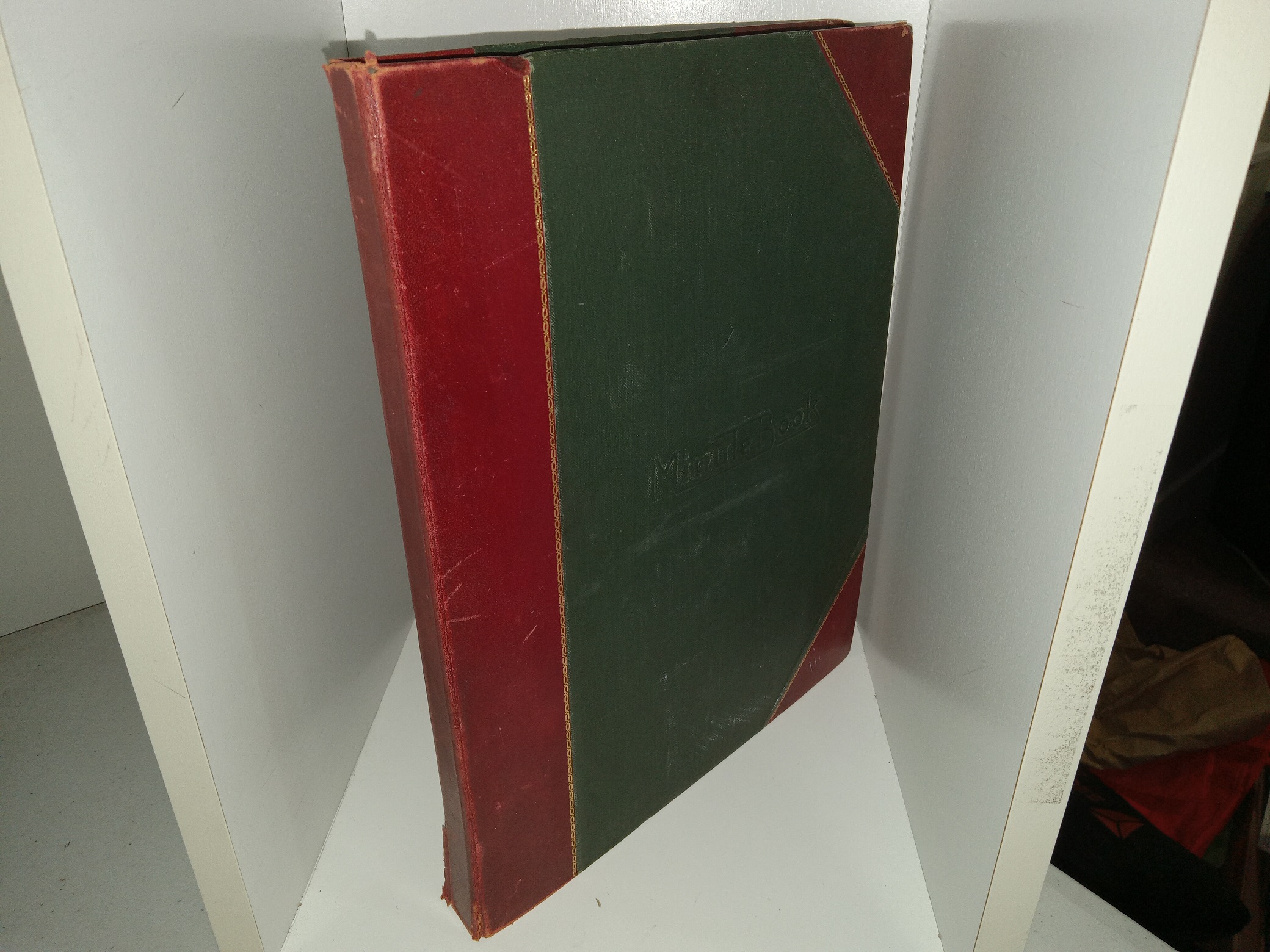 Fair condition, large hardcover with a maroon spine, and no dust jacket. The cover has dents, scuffing scratches, tears, small pieces torn off, fraying, stains, crushed corners, and fading. The front inside cover has a small pieces torn off and scuffing where the binding connects. The front flyleaf cover has been torn from the internal binding, has fading, wrinkling, and creasing. Some pages have yellowing at the edges, or creases. The first page has writing in pencil. Text throughout is clear and legible.