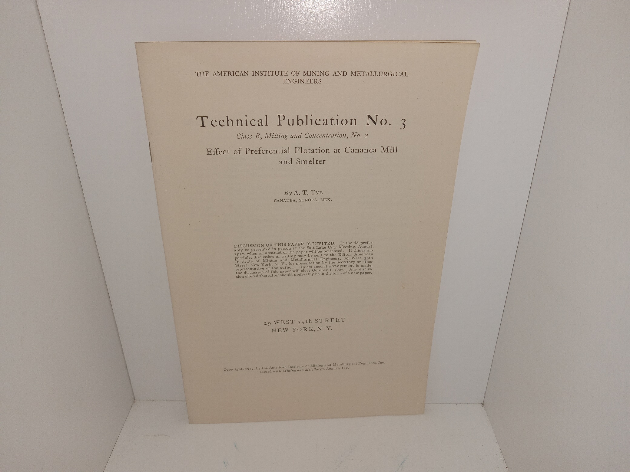 The American Institute of Mining and Metallurgical Engineers Technical Publication No. 3: Class B, Milling and Concentration, No. 2: Effect of Preferential Flotation at Cananea Mill and Smelter