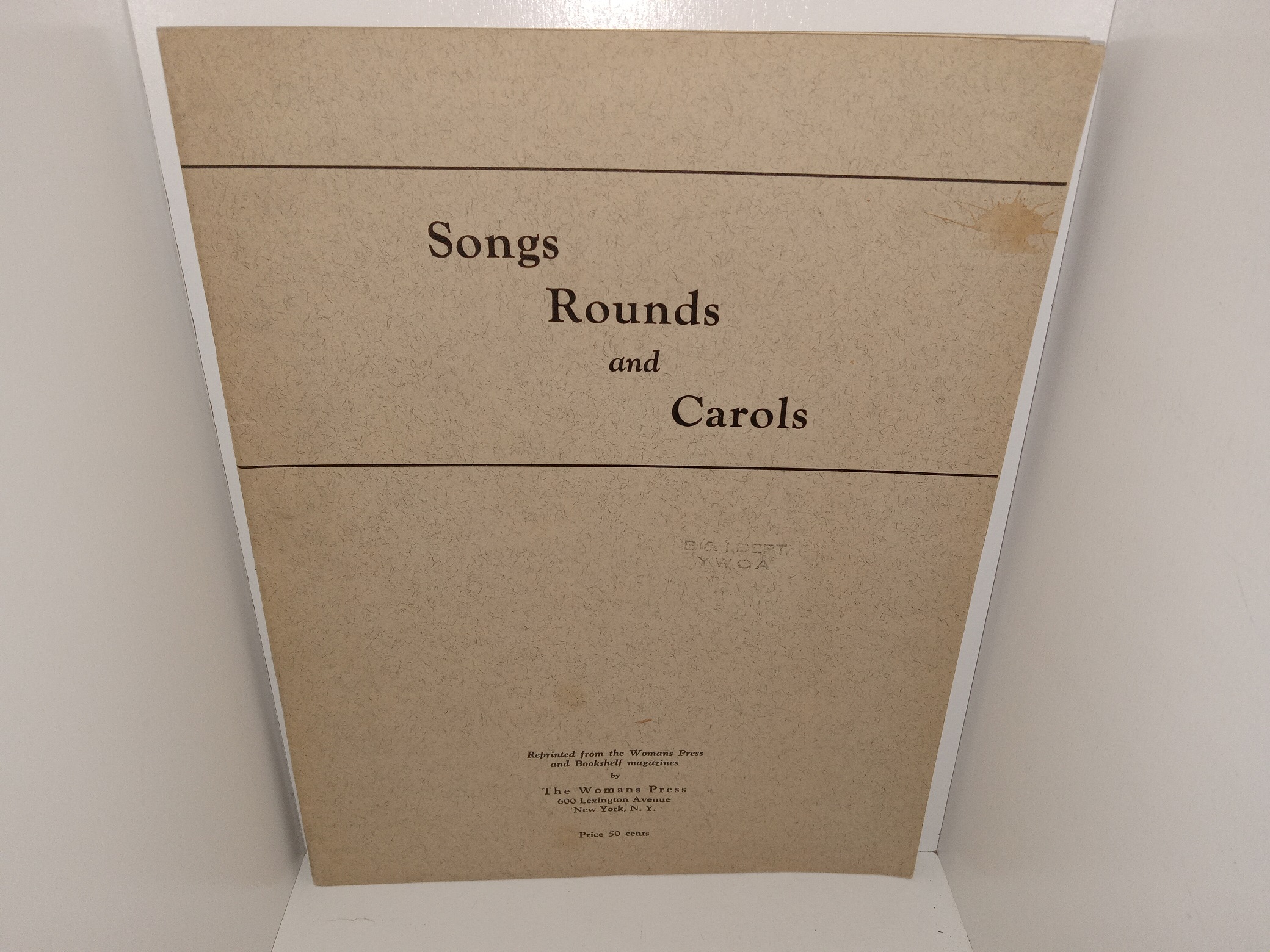 Fair condition, thin, tan, staple-bound softcover. The cover has some stains, ink stamps, yellowing, and some minor creasing. The first page has writing in pencil. Text and illustrations throughout are clean, clear, and legible.