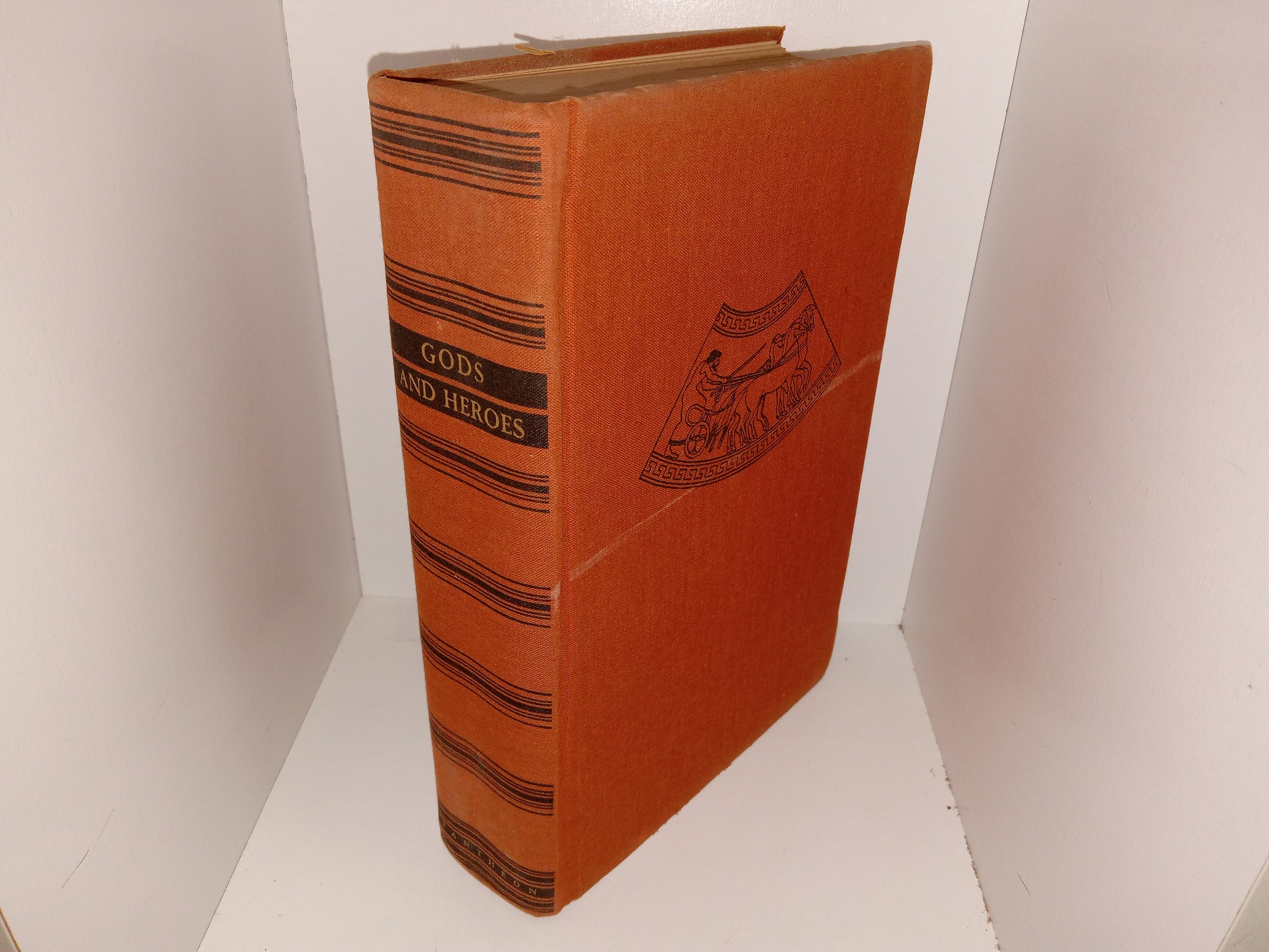 Fair condition, thick, dark orange hardcover with no dust jacket. The cover has long pale scuff marks, some fading, tiny tears on the edges, and crushed corners with tiny tears. Some pages have small stains, but the text and illustrations throughout are clear and legible. The front flyleaf has writing in pencil.