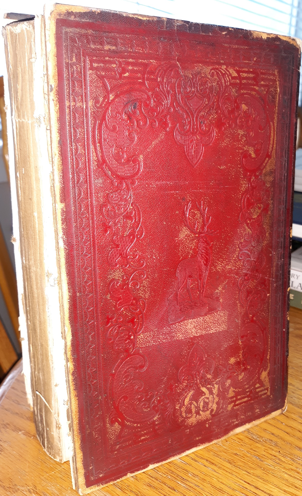 Fair condition, maroon, leather-bound book with the spine torn off. The remaining front and back covers have scuff marks, scratches, stains and some tears. The first flyleaf is torn off, but still included. The flyleaf has some writing in pencil. Pages throughout have stains, but they do not interfere with the legibility of the text or illustrations. Some pages are dogeared…………………………………..v1 Bx1571A