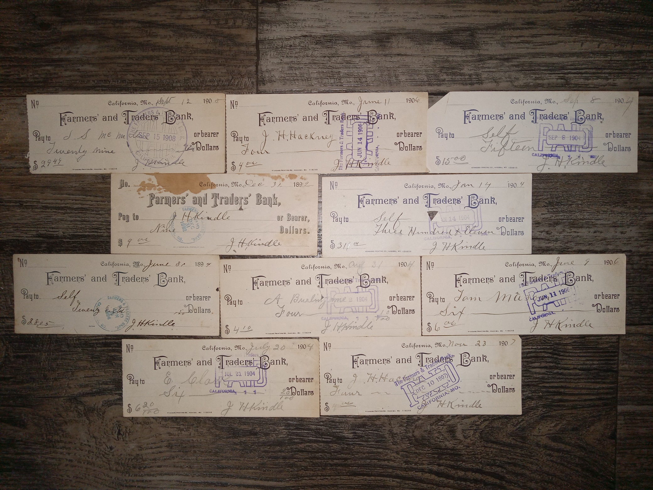 10 fair condition checks, all of which having been filled out in pen and pencil. The checks also have ink stamps, creases, tears, stains, and pieces torn off.