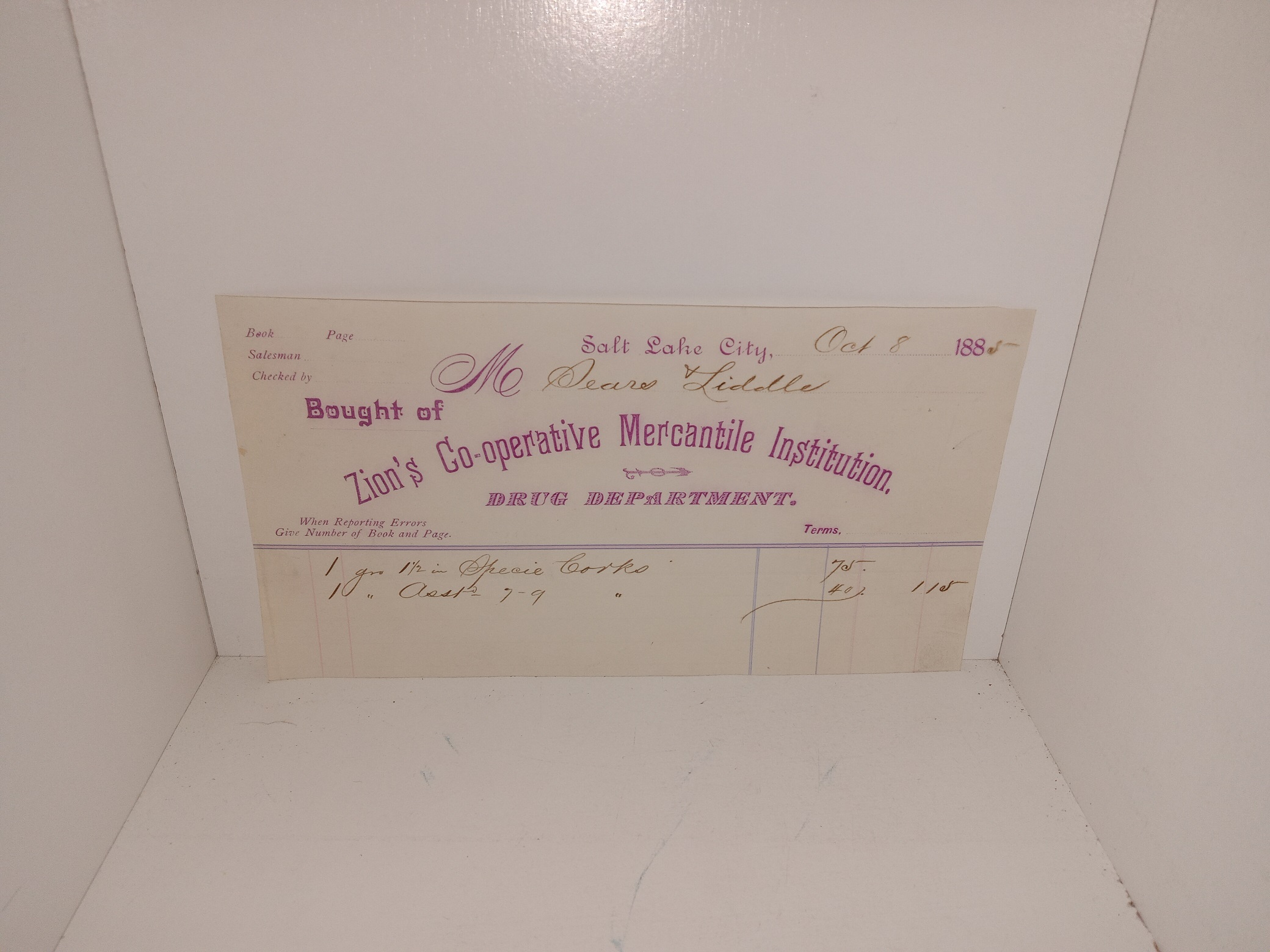 Fair condition receipt dated for 1885. The receipt has been filled out in pen, has some slight ink smudging, creases, wrinkling, and faint stains.