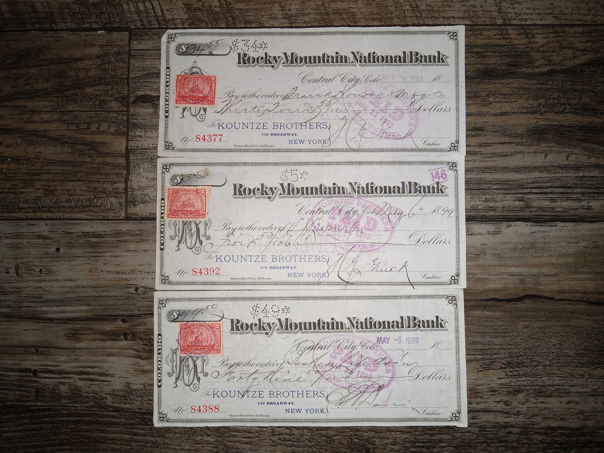 3 fair condition, old checks. The checks have been filled out in pen, and have various markings from use, including postage stamps, ink stamps, and patterns made with tiny holes. There is also some wrinkling, and faint stains.