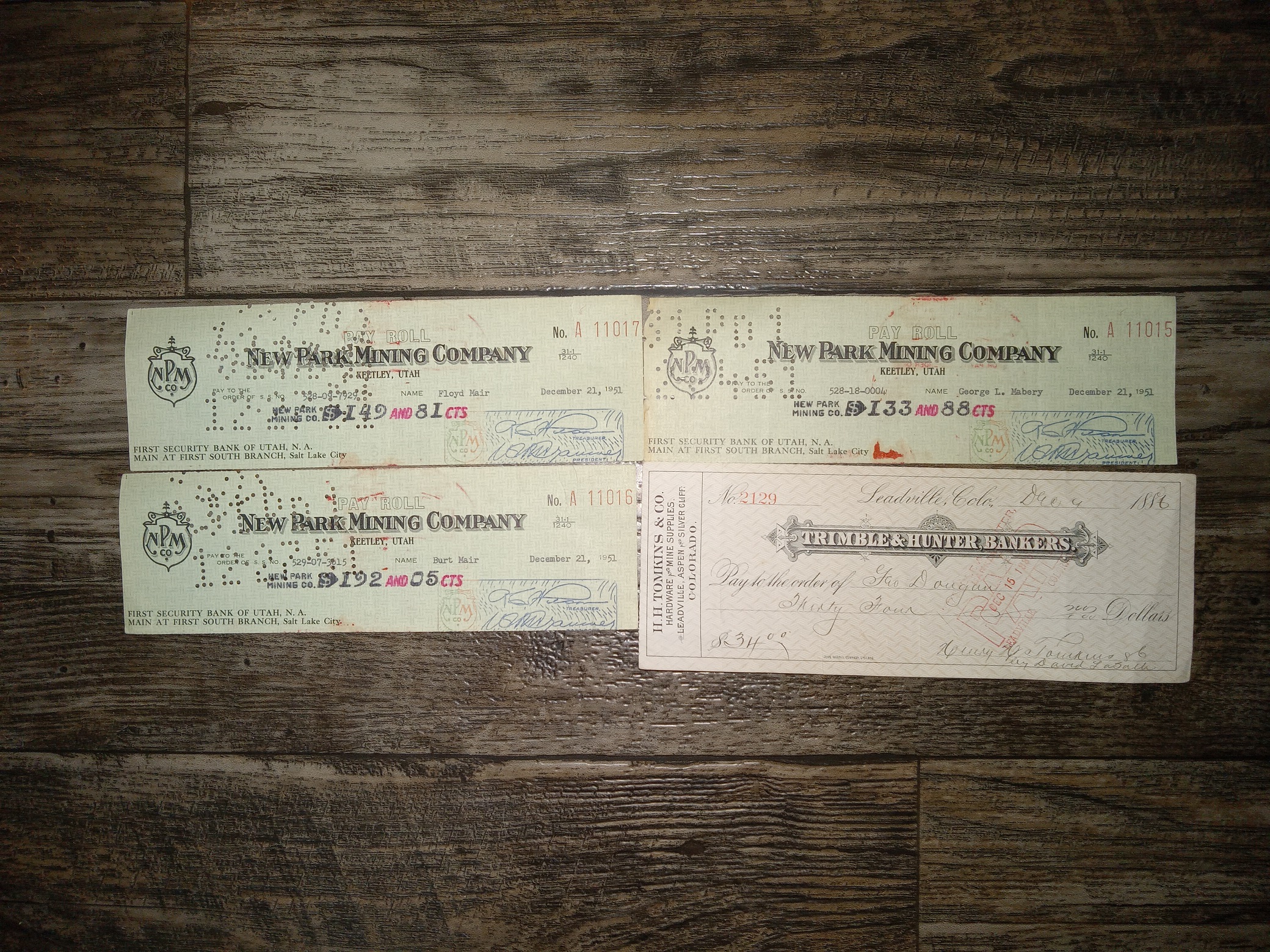 4 fair condition, checks. The checks have some stains, ink stamps, tiny holes punched in, small tears, small pieces torn off, creases, writing in pen, and ink smudges.