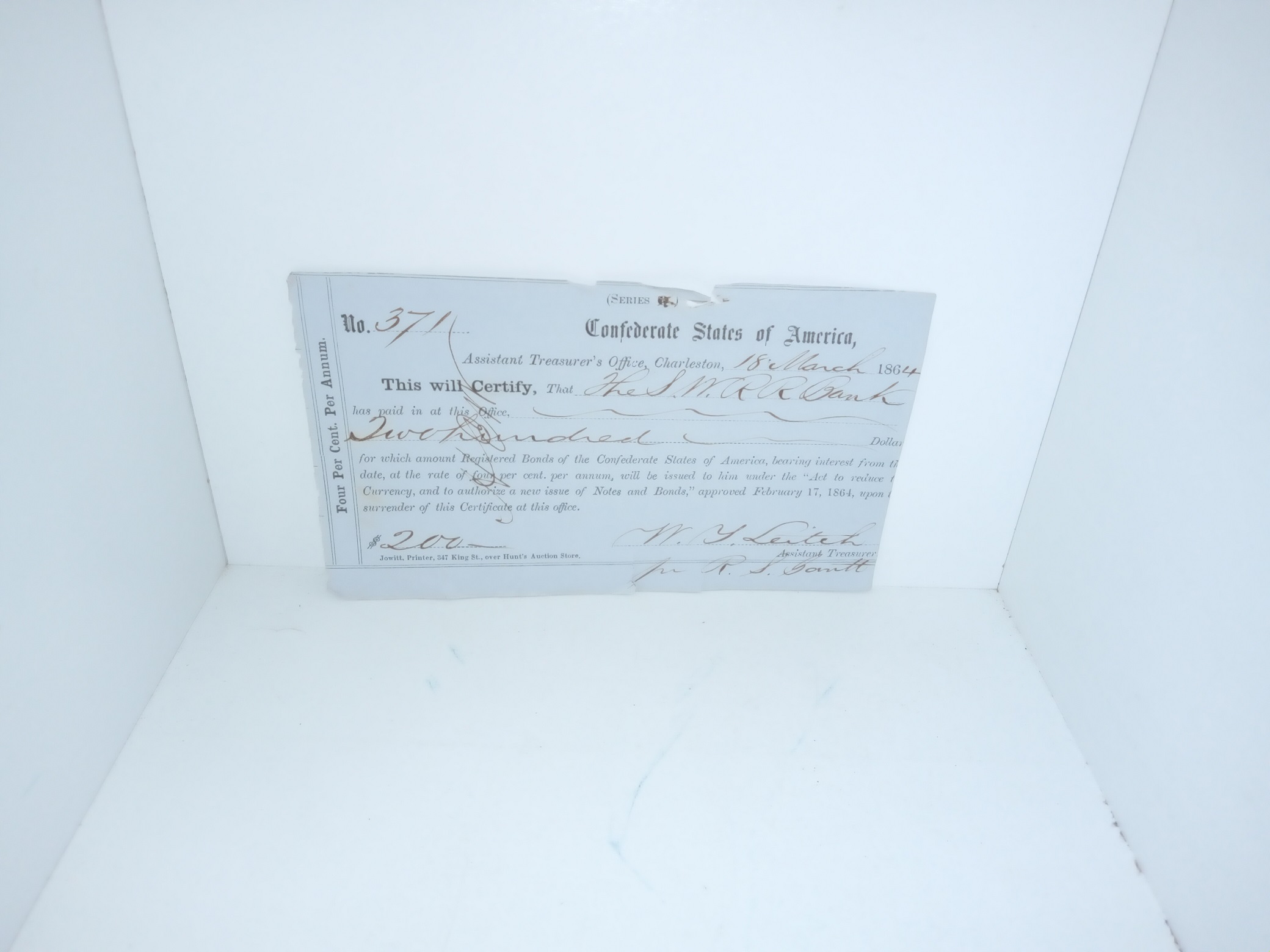 Fair condition, certificate that has been filled out in pen. The certificate has stains, tears, some pieces torn off, creases, and wrinkling.