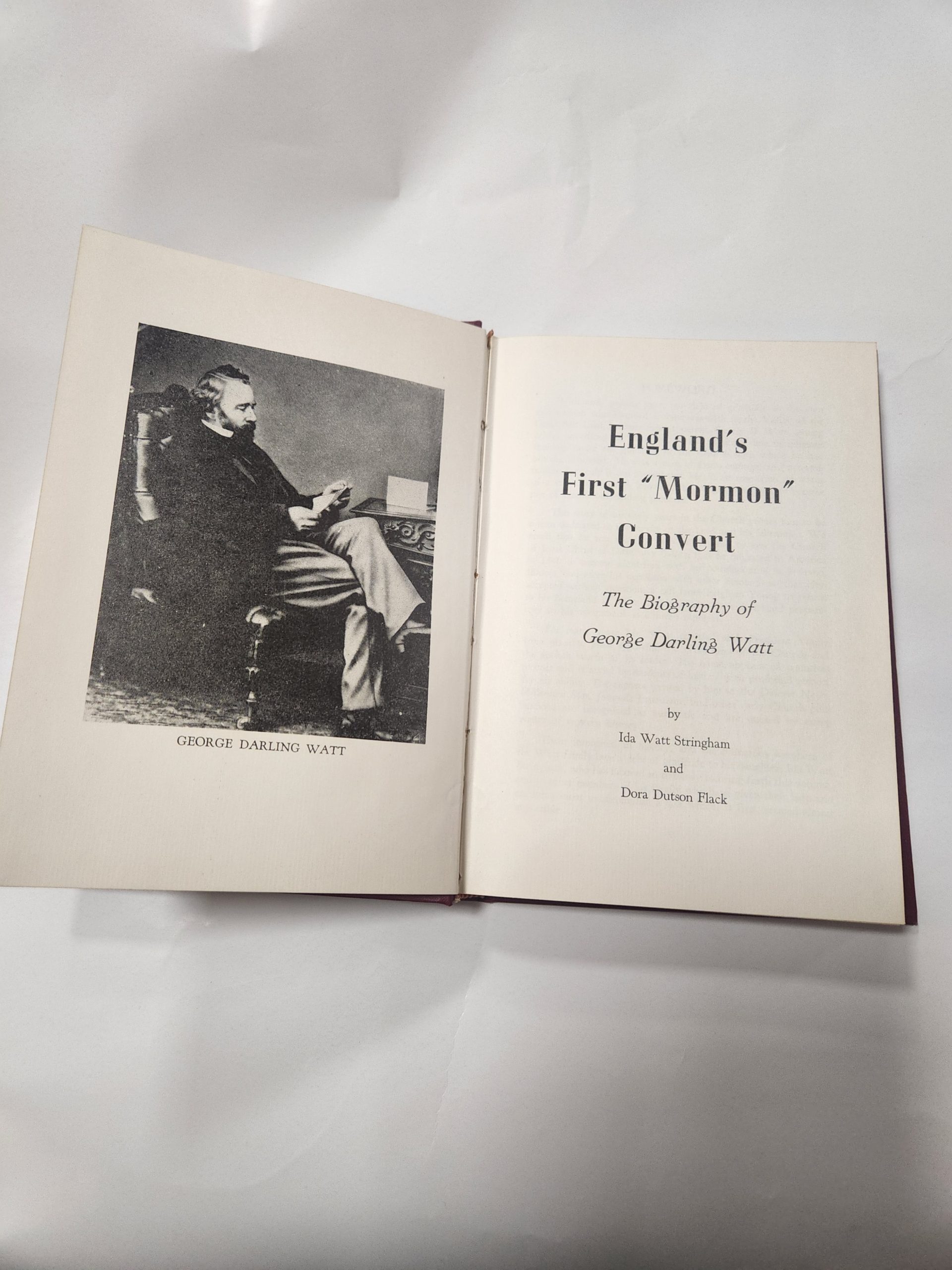 England’s First “Mormon” Convert: The Biography of George Darling Watt by Ida Watt Stringham & Dora Dutson Flack (hardcover, no jacket) No markings on pages, a few pages in the middle of book has crease on the bottom right corner. A few dings and scuffs on cover.