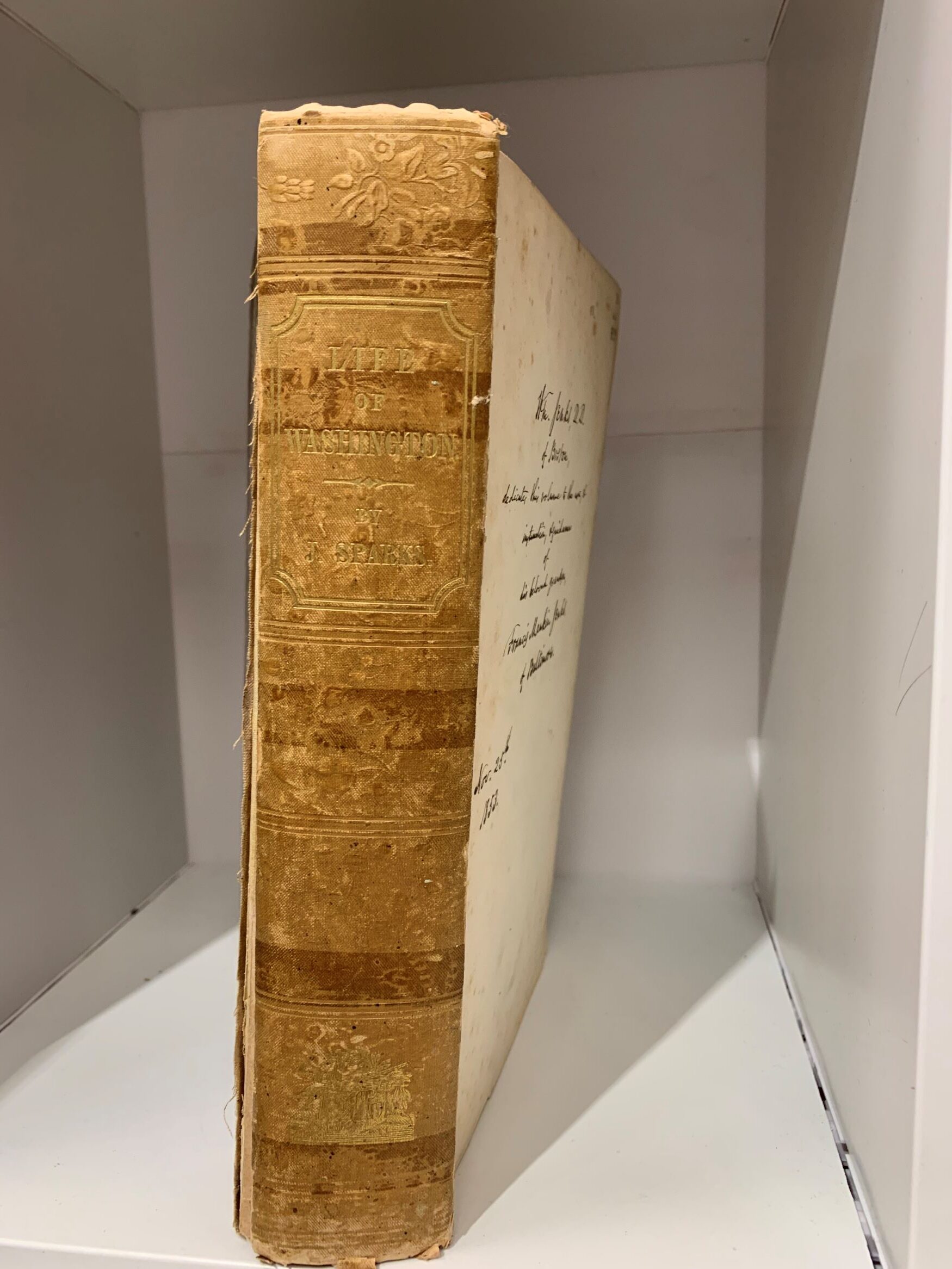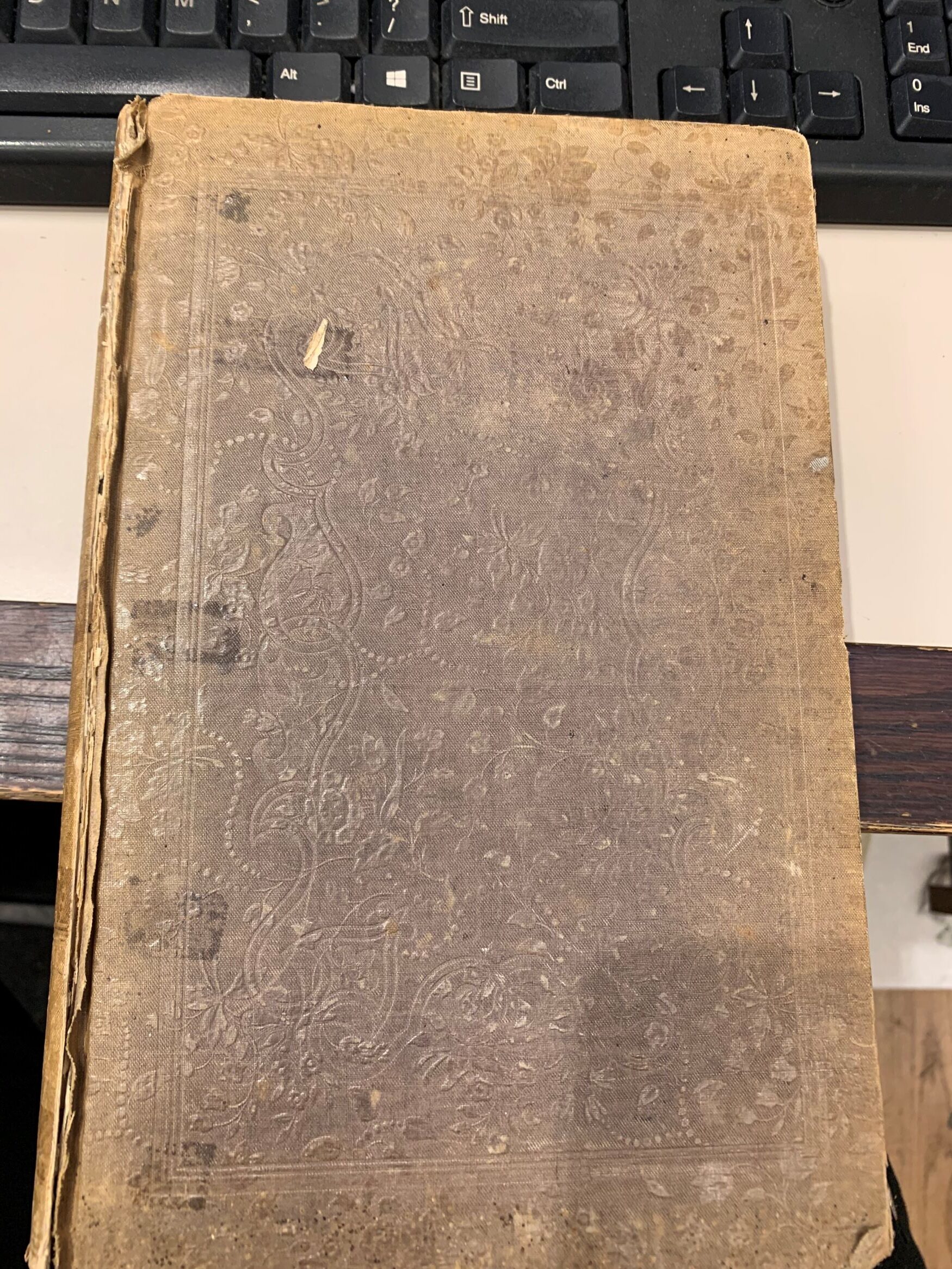 Front Cover of the book fell off. There is tearing and heavy creasing on the spine of the book. Discoloration and staining on front and back cover as well as well as tape residue from a previous owner taping the cover back to the book. Binding is hanging on by a thread. The gold lettering on the spine of book is still intact and readable. Pages of the book are protruding out of the book but still connected to the spine. The edges of the pages have little black dots on them Slight water damage on all the pages and the pages do not lay flat.