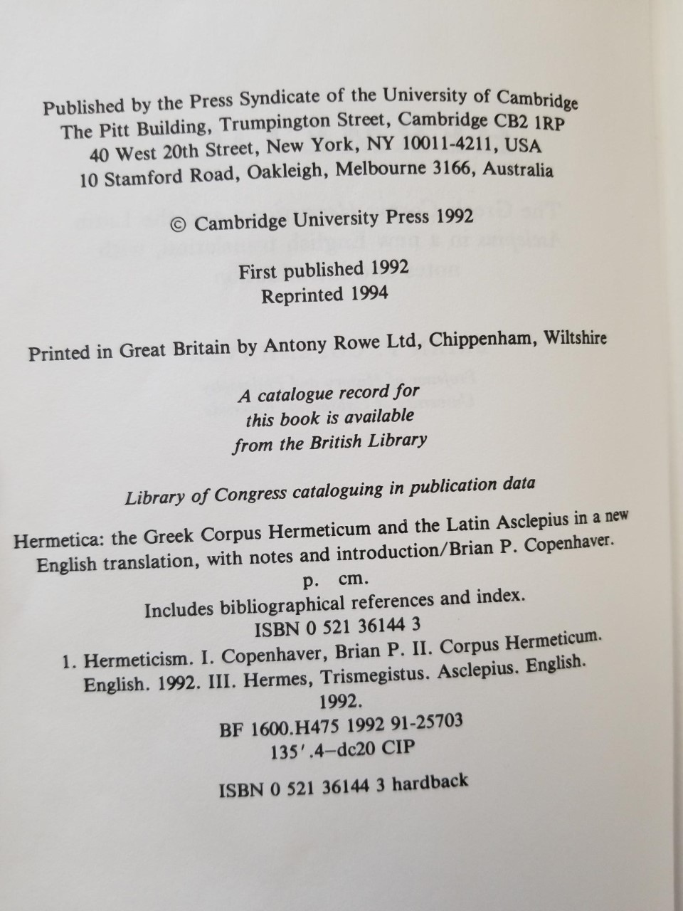 1994 ~ Brian P. Copenhaver ~ Hermetica ~ The Greek Corpus Hermeticum and the Latin Asclepius in a new English translation with notes and introduction — ISBN: 9780521361446