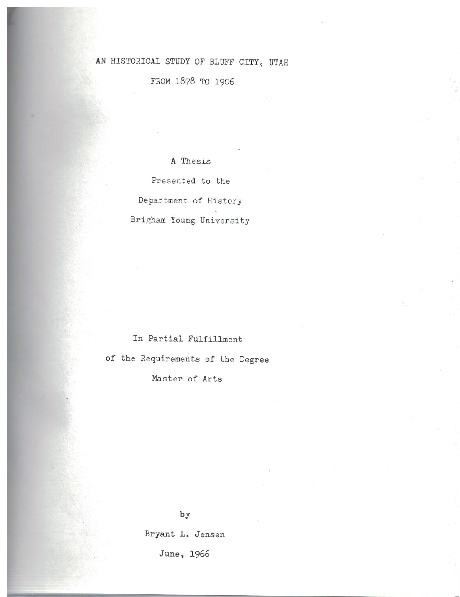 This study of Bluff City is to record the results of one of the most amazing colonizing treks in the annals of the American West. A historical thesis given by Mr. Bryant Jensen to Brigham Young University.