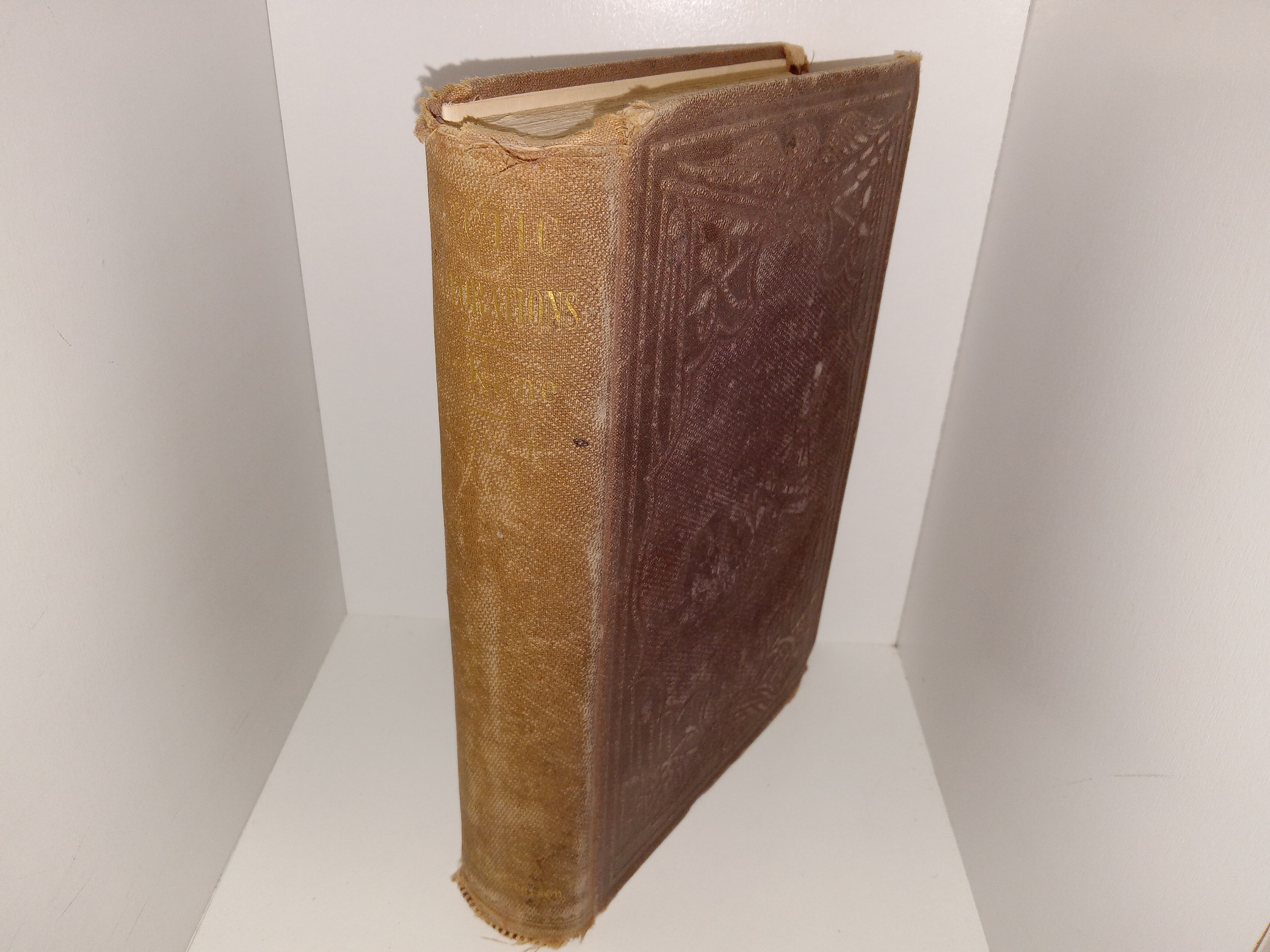 Fair condition, brown hardcover with no dust jacket. The cover has stains, scuffing, fading, some tears, fraying, dented edges, and crushed corners. The internal binding is torn. The inside covers and flyleaves are wrinkled. The front inside cover has a large sticker. Some pages have stains. The flyleaves both have writing in pencil and eraser marks. The page immediately before the title page has been torn from the binding, but is still included.