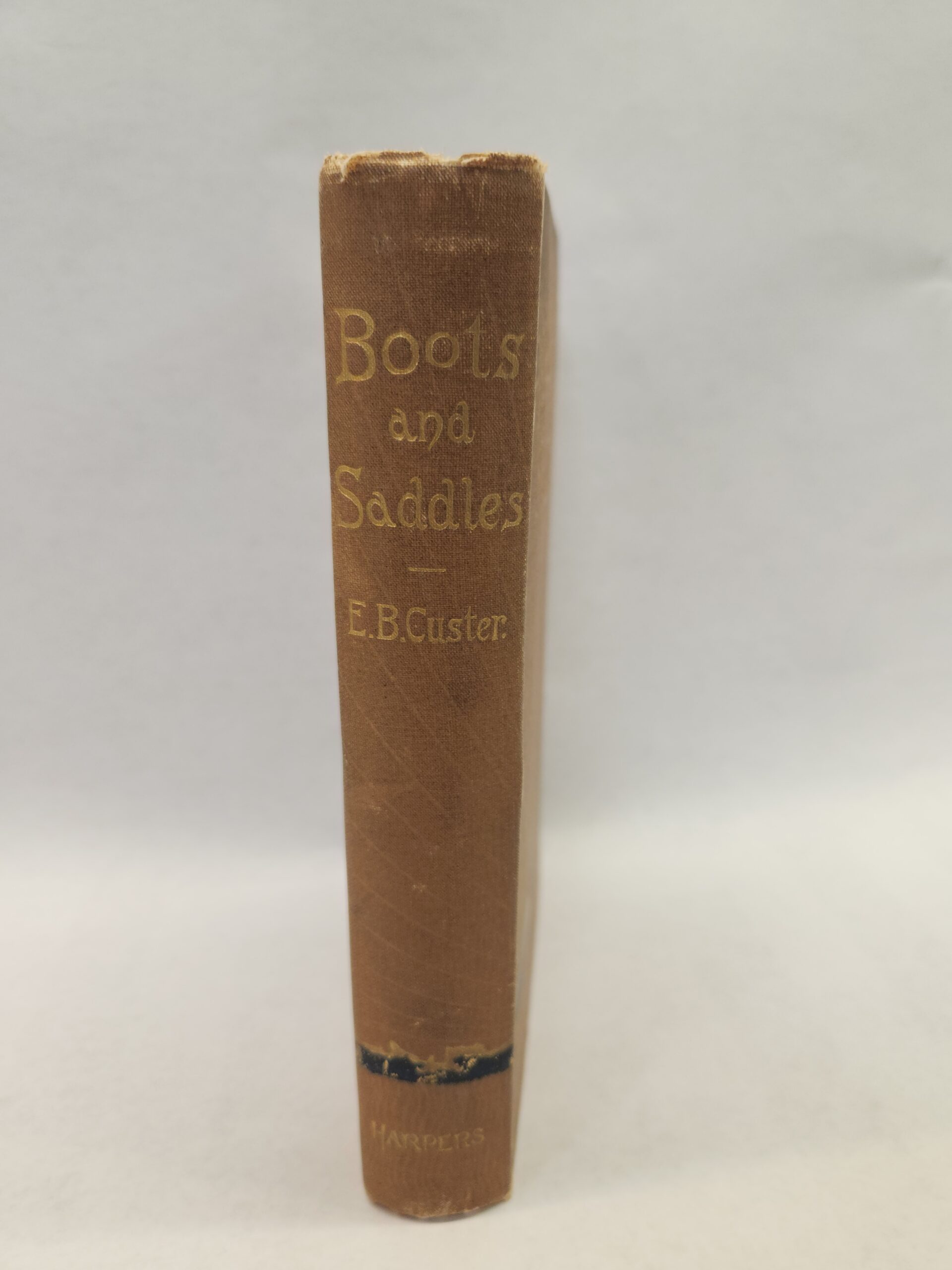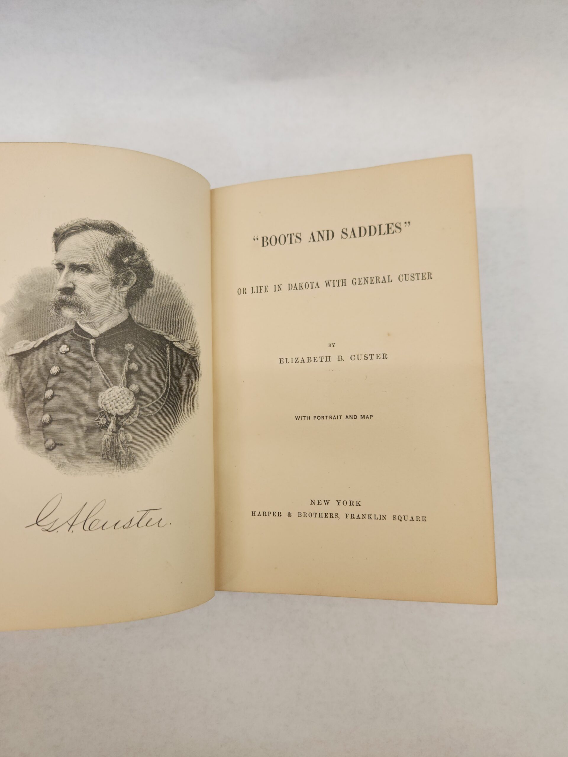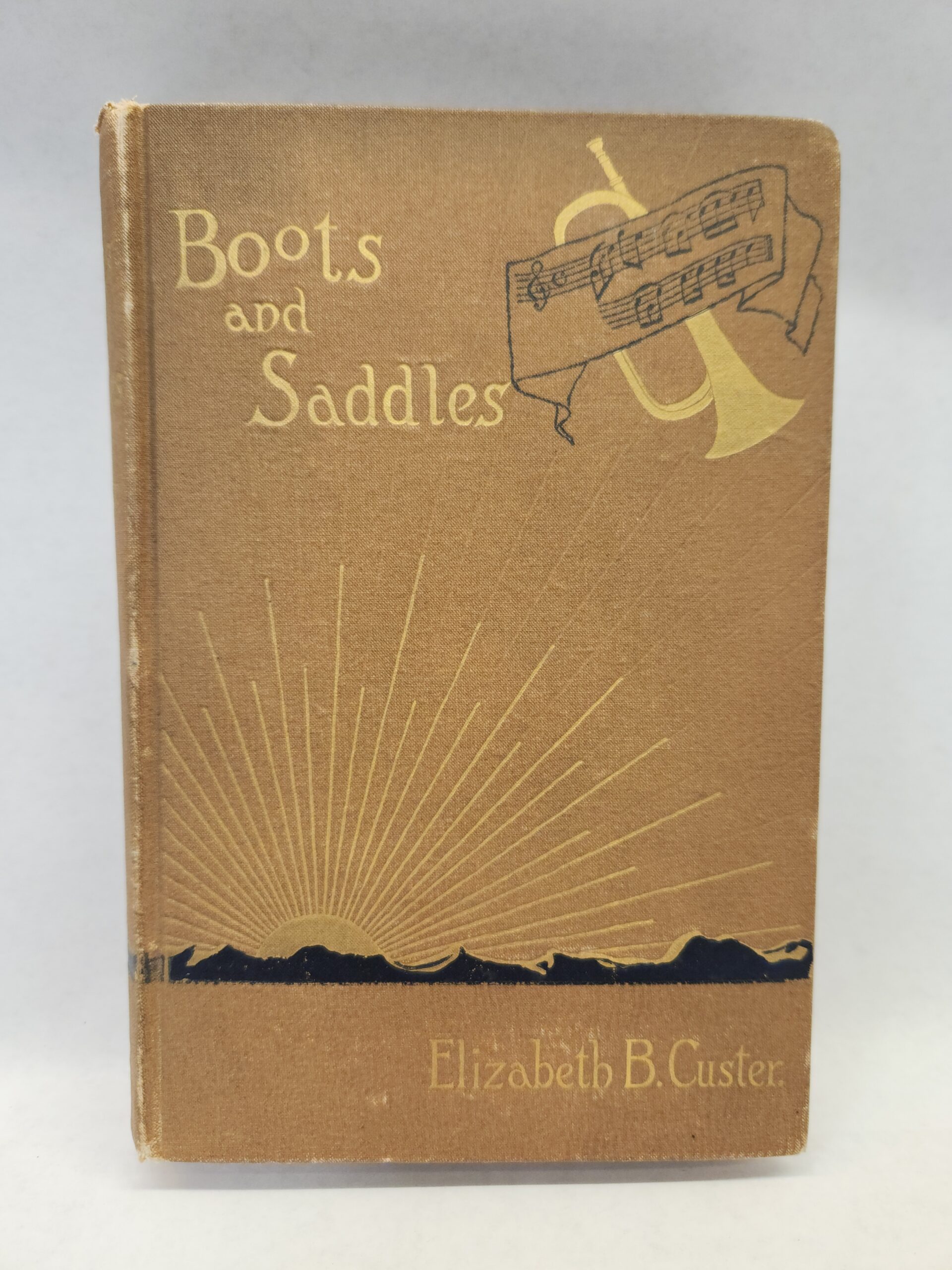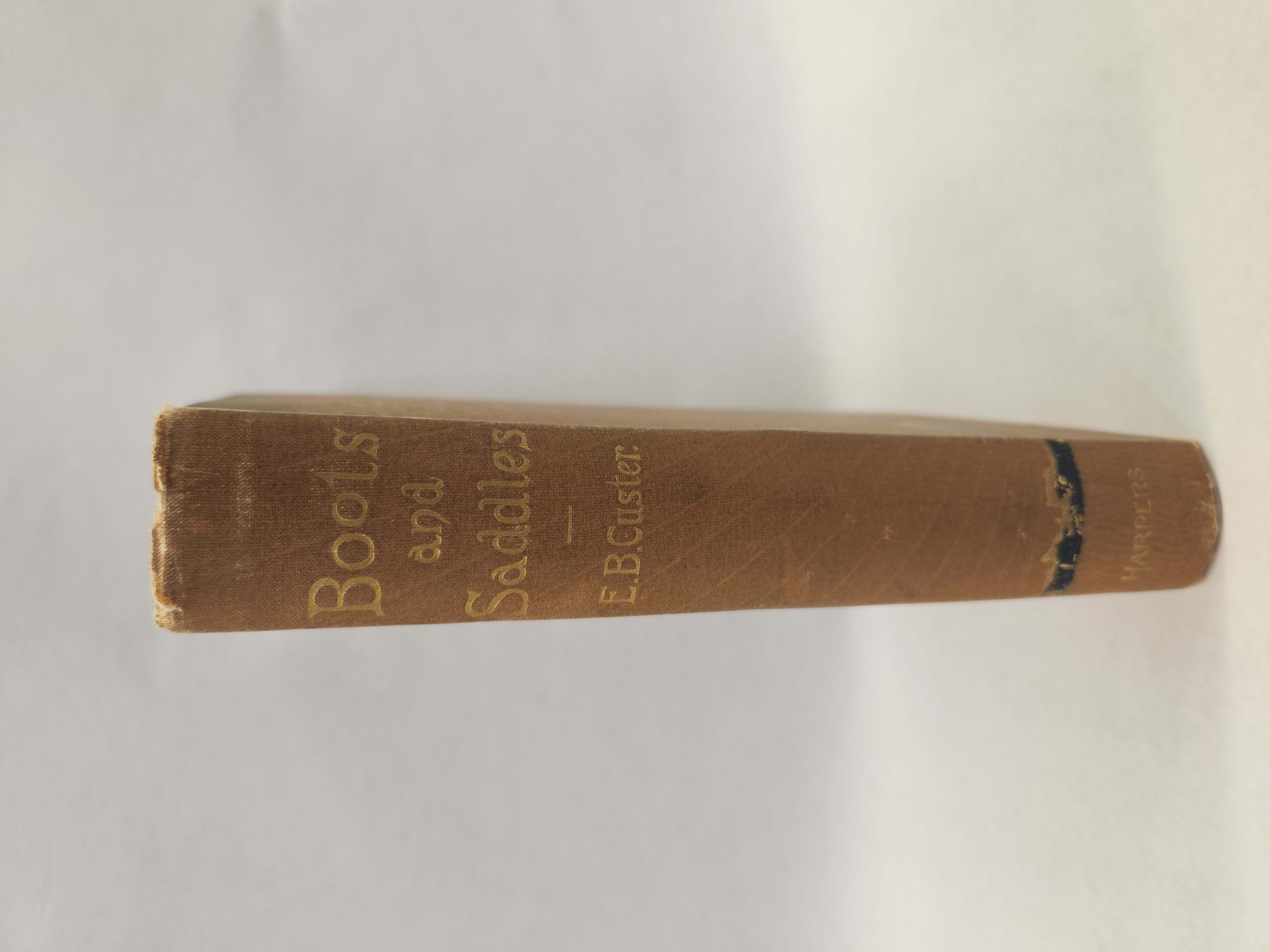 Boots and Saddles (1885 Edition, Hardcover) Binding is starting to loosen and fist page is only holding on top quarter (see pic in gallery) but pages are still holding. Corner and edges show some shelf wear. No writings/marks on the pages except for the first blank page has a name written in. Back cover has a few smudge marks.