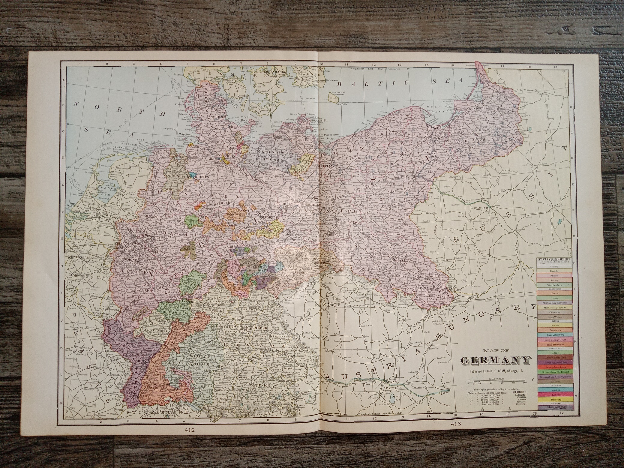 Map taken from a large, old atlas, 22 inches tall; 14 inches wide. Folded in half; good condition. The map has some ink bleeding, the edges have some tears, and there’s a little writing in pencil.