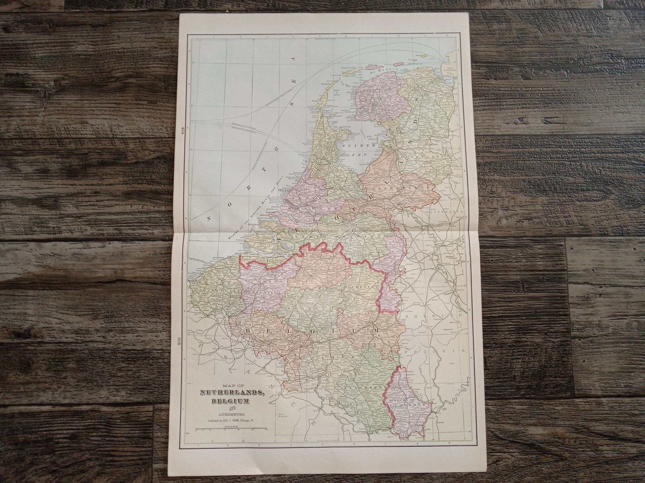 Map taken from a large, old atlas, 22 inches tall; 14 inches wide. Folded in half; good condition. The map has some faint stains, edges have some tears, and there’s a little writing in pencil.