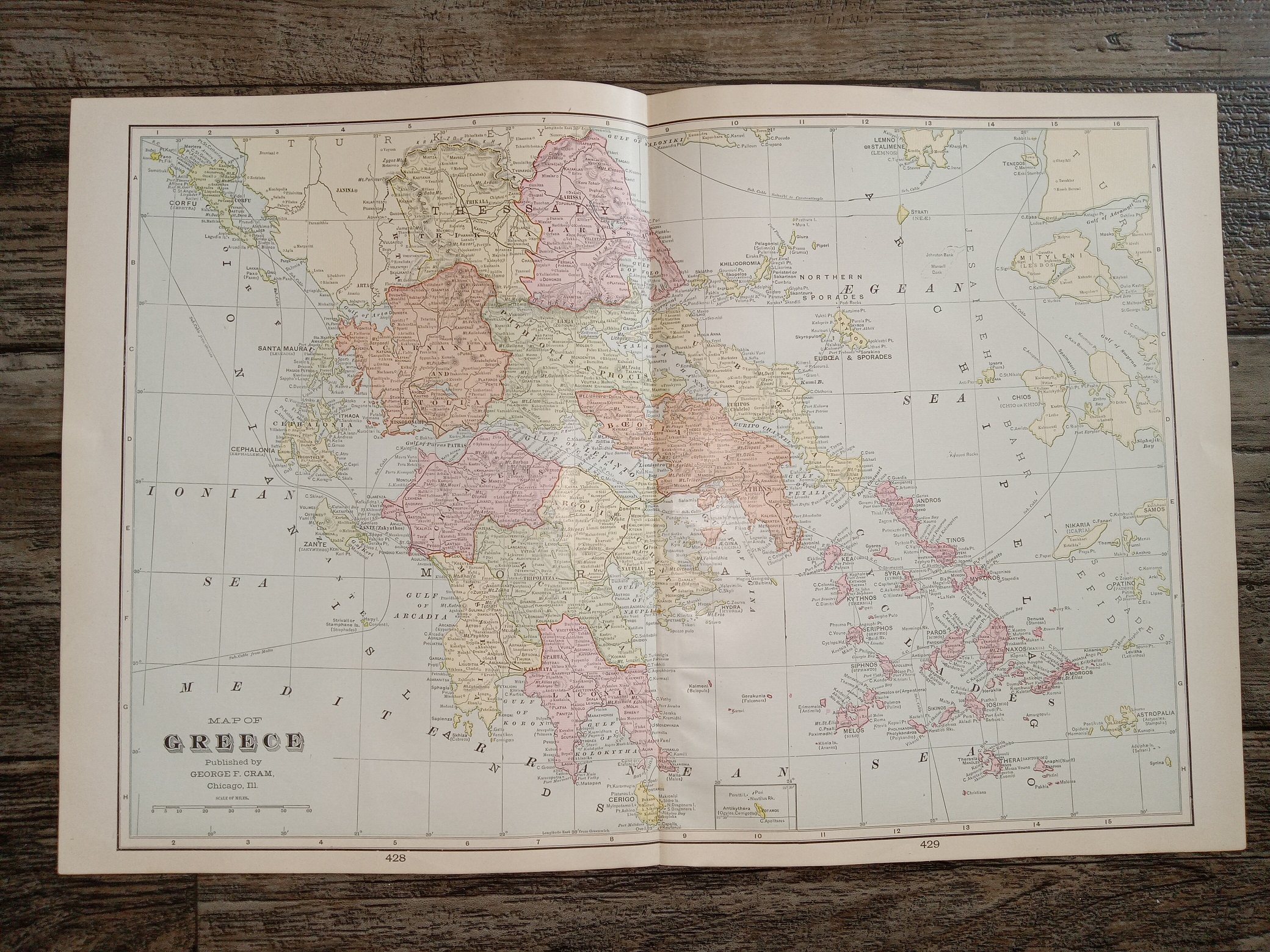 Map taken from a large, old atlas, 22 inches tall; 14 inches wide. Folded in half; good condition. The edges have some tears, and there’s a little writing in pencil.