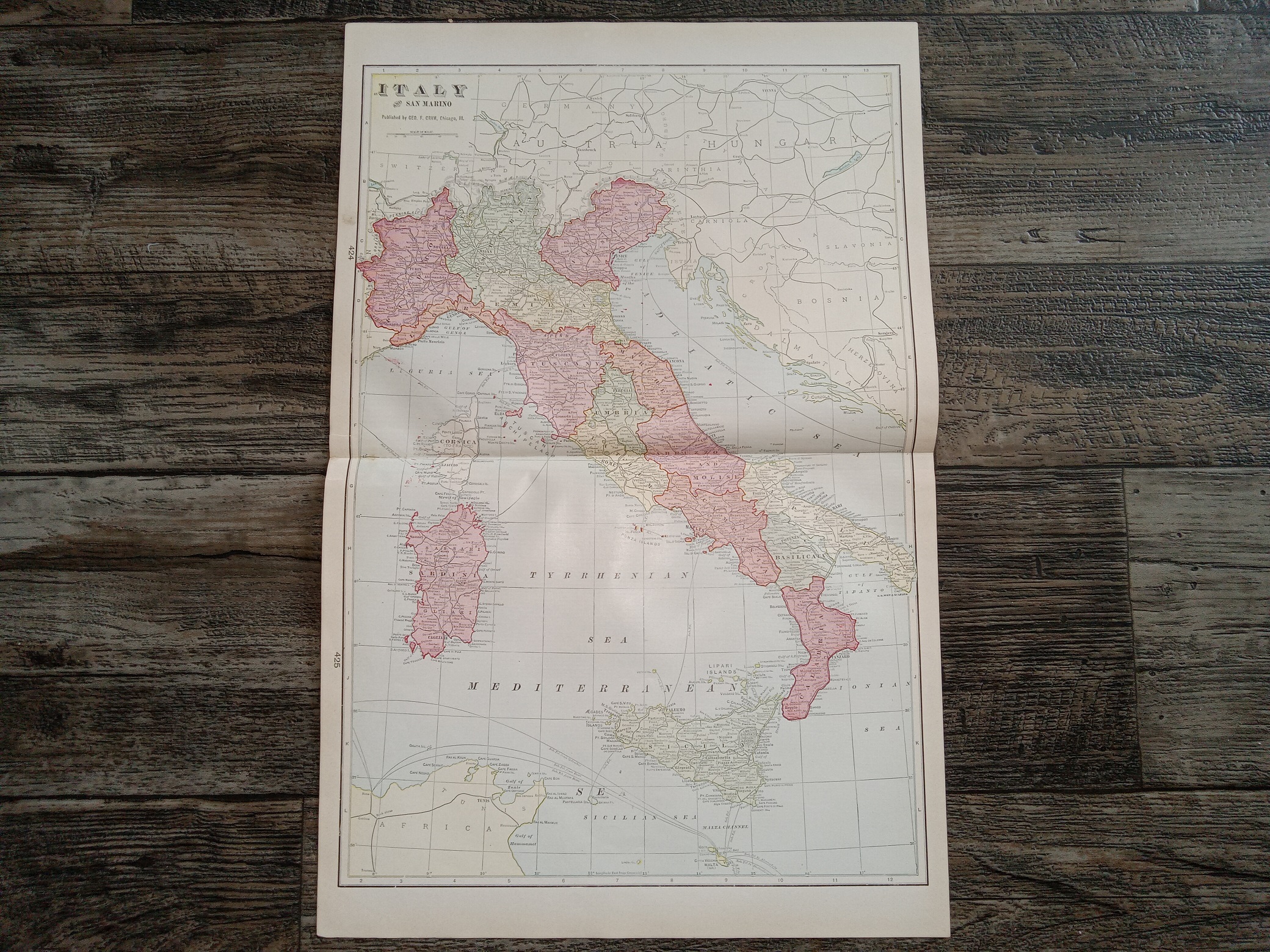 Map taken from a large, old atlas, 22 inches tall; 14 inches wide. Folded in half; good condition. The edges have some tears and minor creasing, and there’s a little writing in pencil.