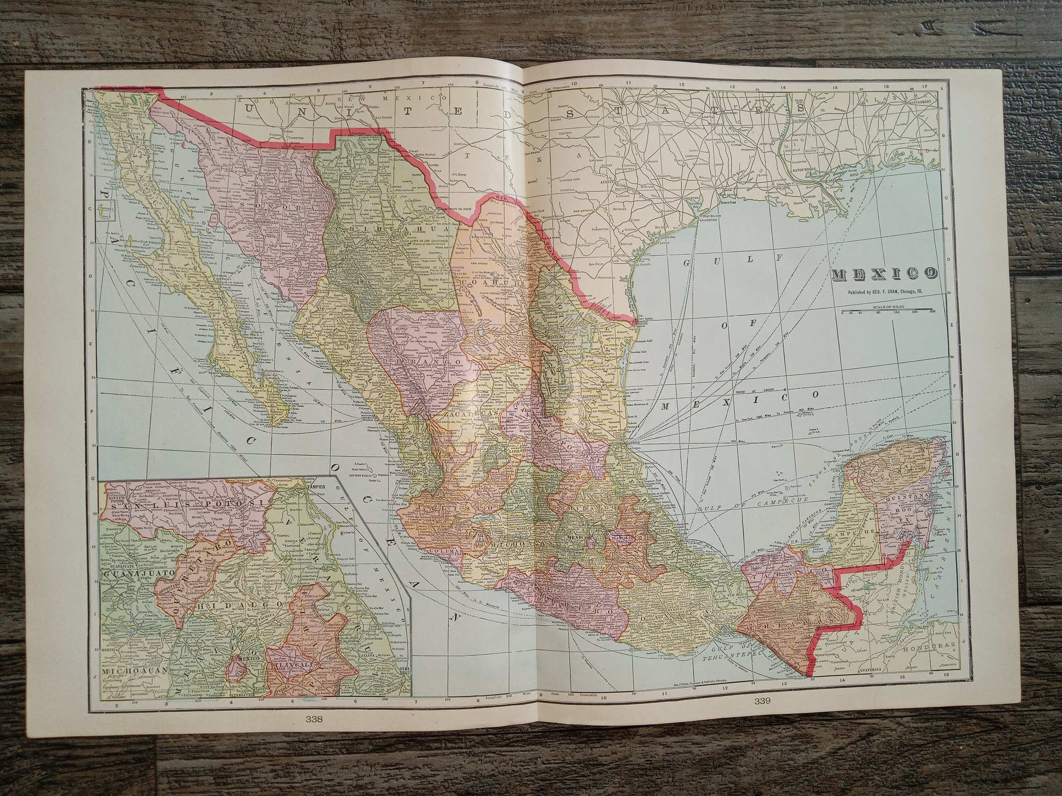 Map taken from a large, old atlas, 22 inches tall; 14 inches wide. Folded in half; good condition. The edges have some tears, and there’s a little writing in pencil.