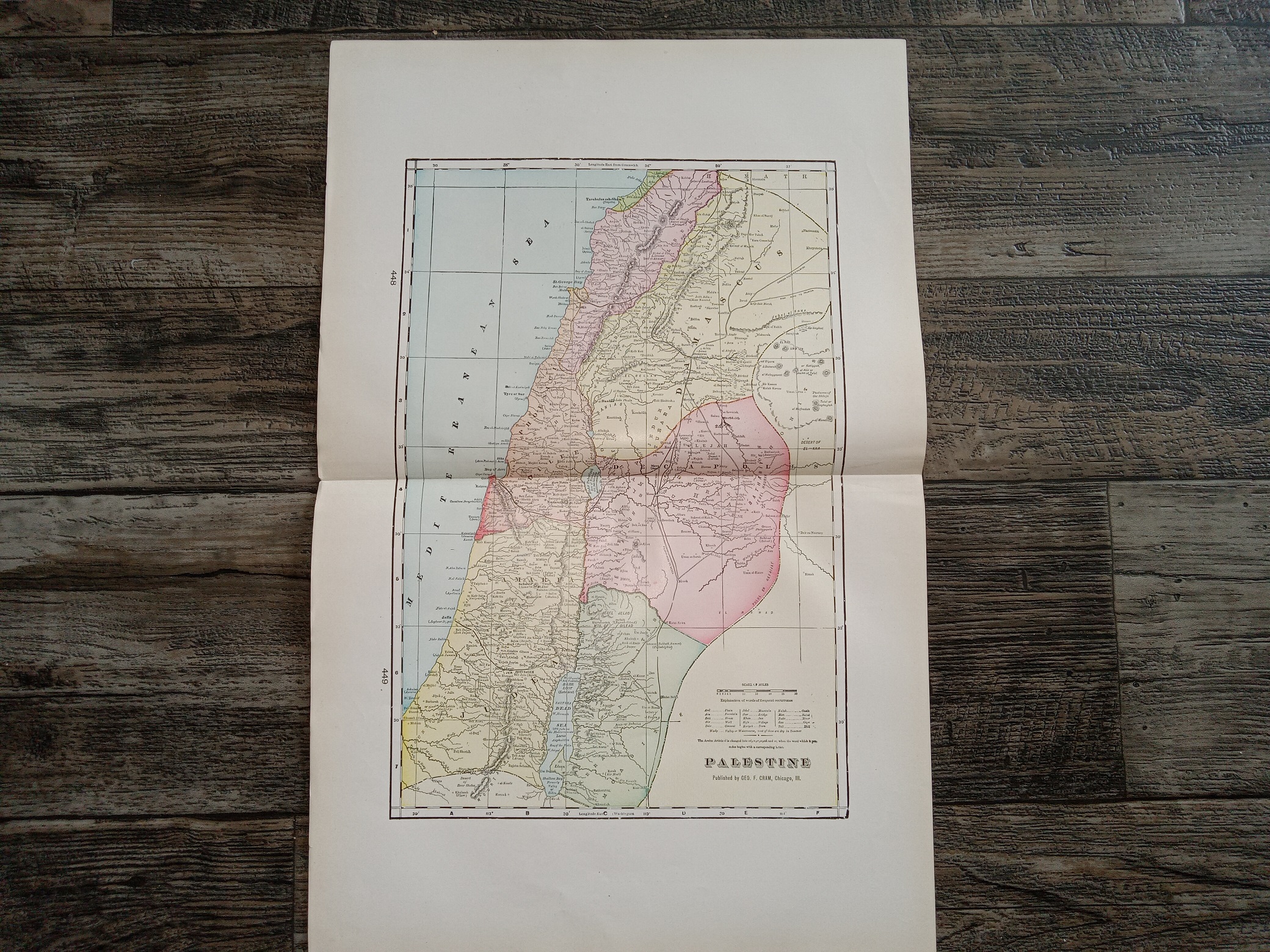 Map taken from a large, old atlas, 22 inches tall; 14 inches wide. Folded in half; good condition. The map has some small stains, the edges have some tears, and there’s a little writing in pencil.