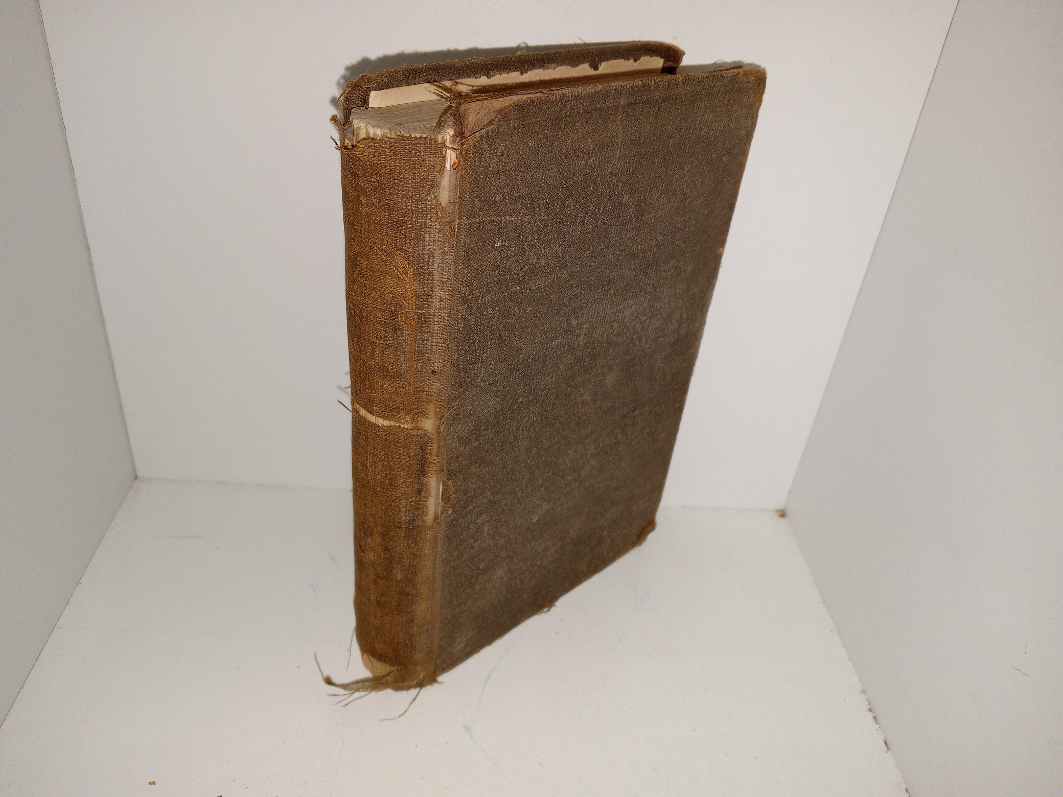 Fair condition, small, brown hardcover with no dust jacket. The cover is detached from the binding of the book, but the pages are still holding together. The cover also has tears, pieces torn off, fraying, fading, stains, scuffing, and bent corners. The inside covers have stains. There is some tape on the internal binding. Some pages have stains or pen marks. The front flyleaf has writing in pencil and eraser marks.