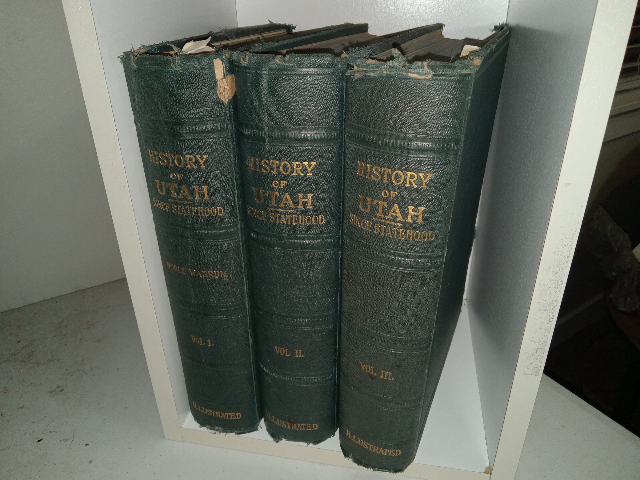 3 fair condition, large, thick, green hardcovers with no dust jackets. The covers have tears, pieces torn off, fraying, scuff marks, and residue. Some pages have minor stains. The internal binding have tears and are loose. The inside covers and flyleaves have stains. The front flyleaves have writing in pencil and eraser marks. Text and illustrations throughout are clear and legible.