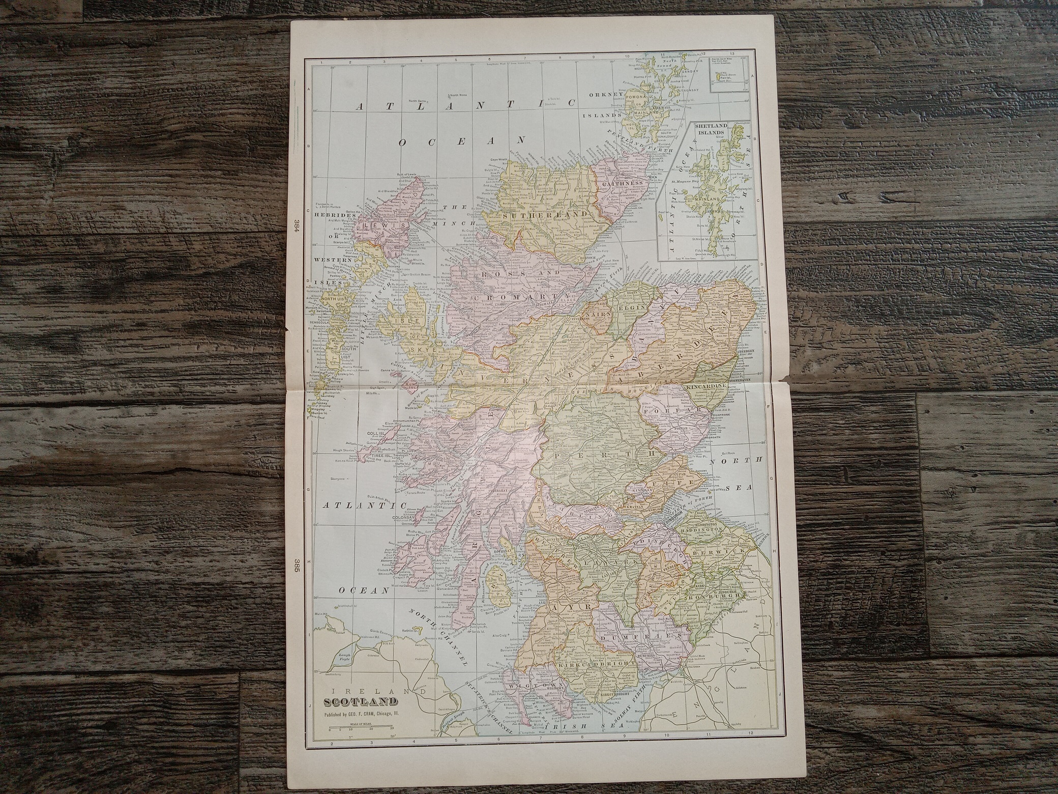 Map taken from a large, old atlas, 22 inches tall; 14 inches wide. Folded in half; good condition. The map has some stains, the edges have some tears or small pieces torn off, and there’s a little writing in pencil.