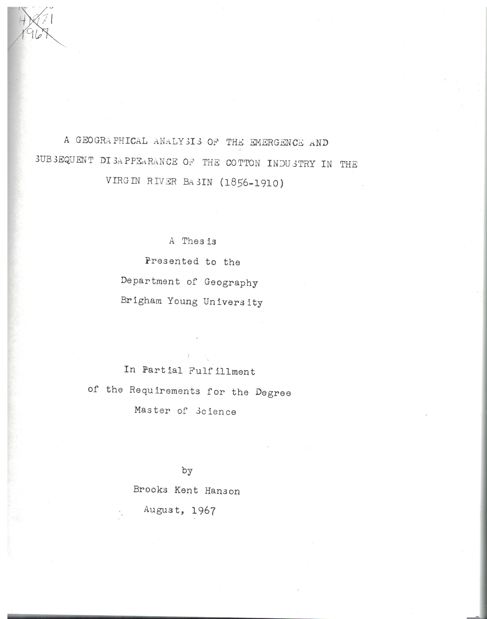 A Geographical Analysis of the Emergence and Subsequent Disappearance of the Cotton Industry in the Virgin River Basin (1856-1910) by Brooks Kent Hanson