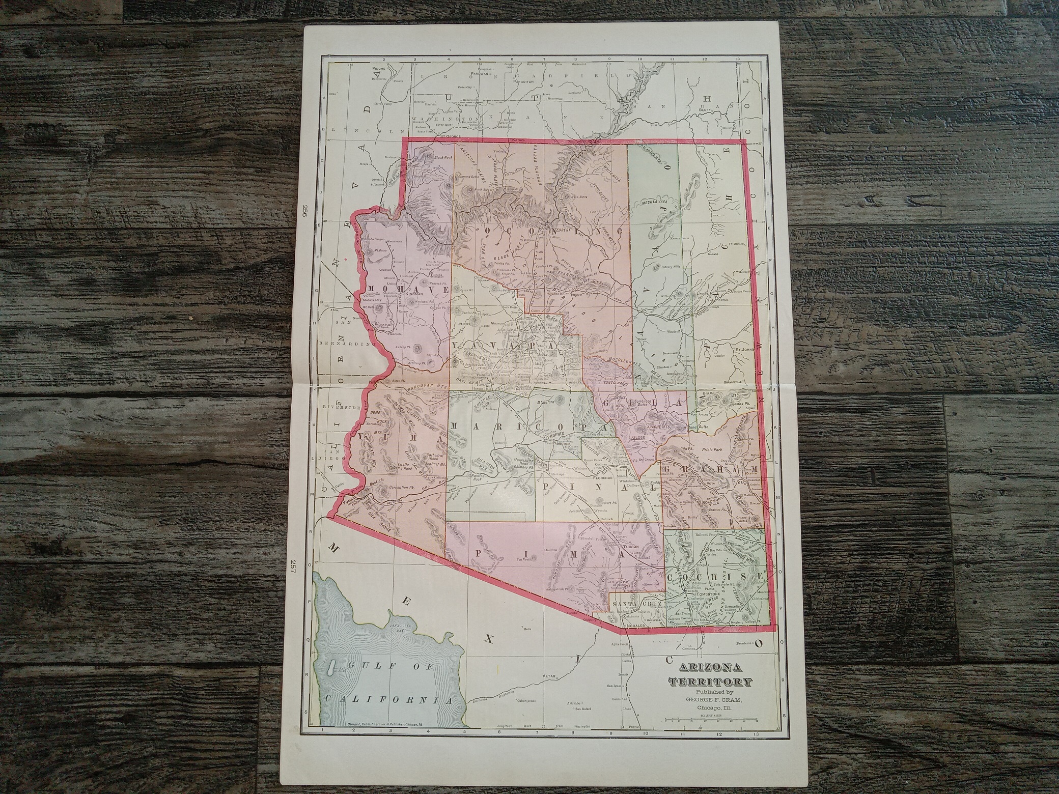 Map taken from a large, old atlas, 22 inches tall; 14 inches wide. Folded in half; good condition. The map has faint stains, the edges have some tears, and there’s a little writing in pencil.