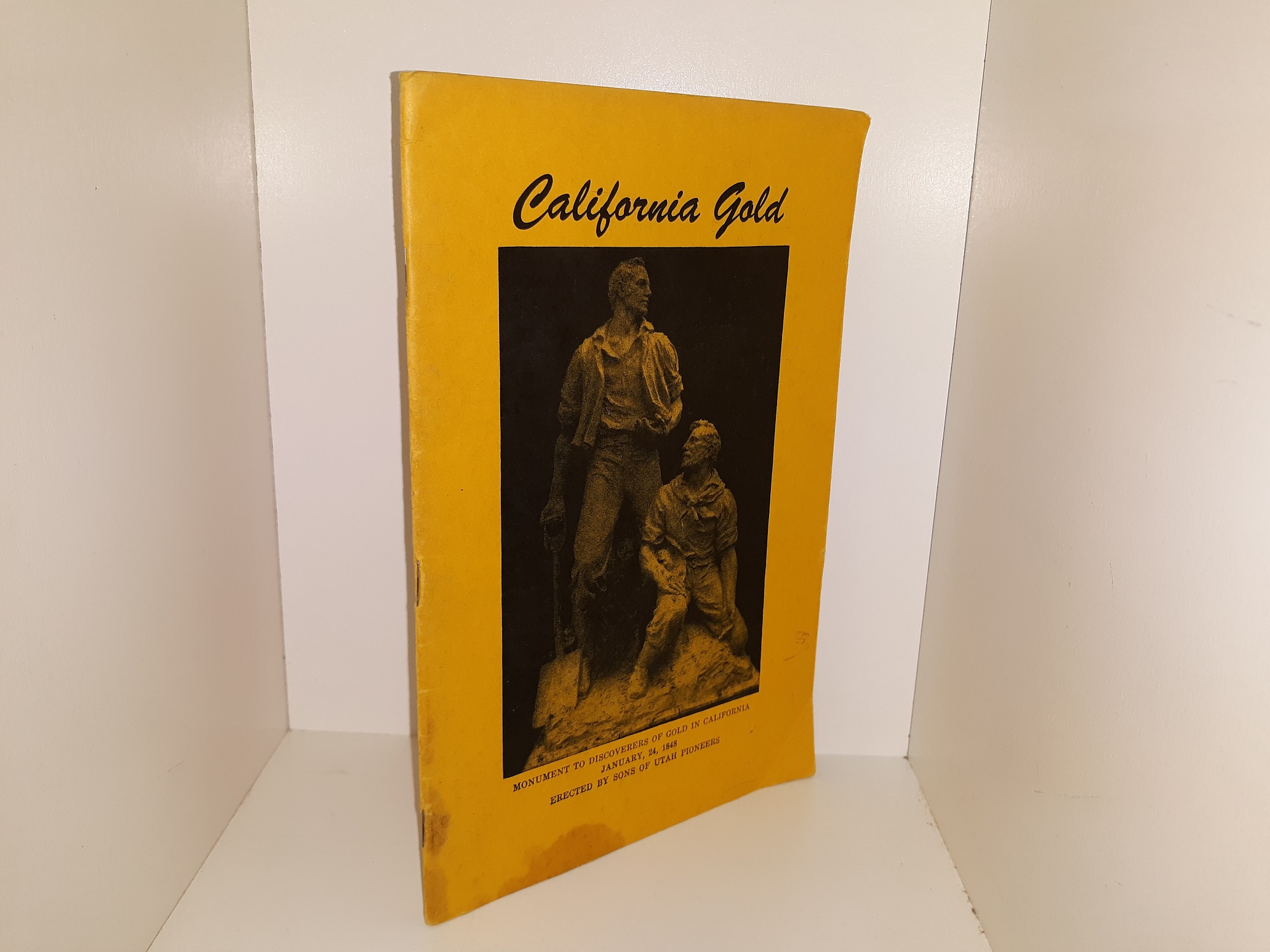 Fair condition, thin, staple-bound, yellow, softcover booklet. The cover has stains, creasing, writing in pencil, adhesive residue, and some wear at the corners and edges. Some pages are creased. The title page has stains, adhesive residue, an old address sticker, and tearing where said sticker was partly removed. Text and illustrations throughout are clean, clear, and legible.