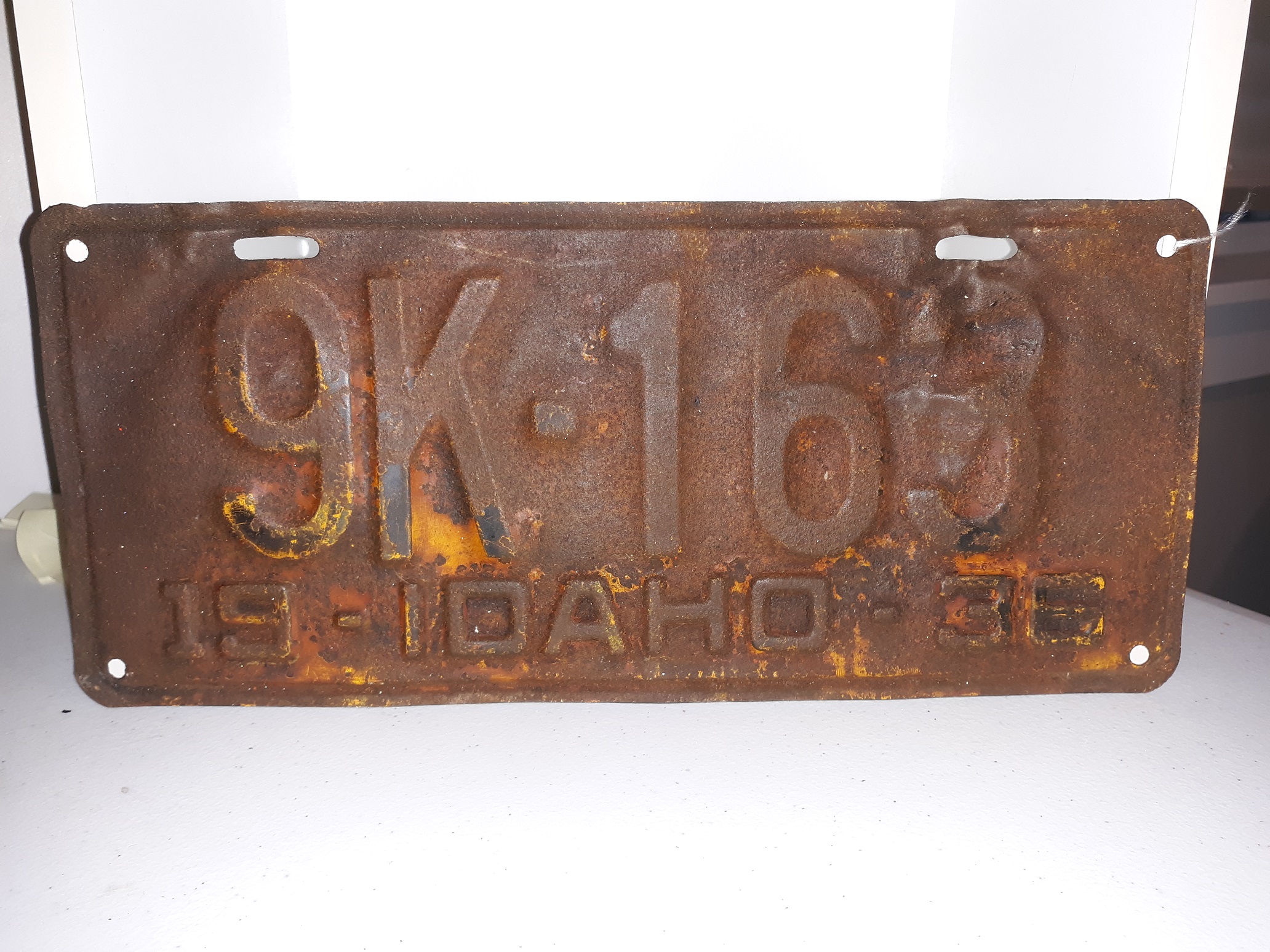 Old and extremely rusted license plate from Idaho in 1936, numbered 9K-163. So heavily rusted that the coloration is unrecognizable…………………v120 Bx1580B