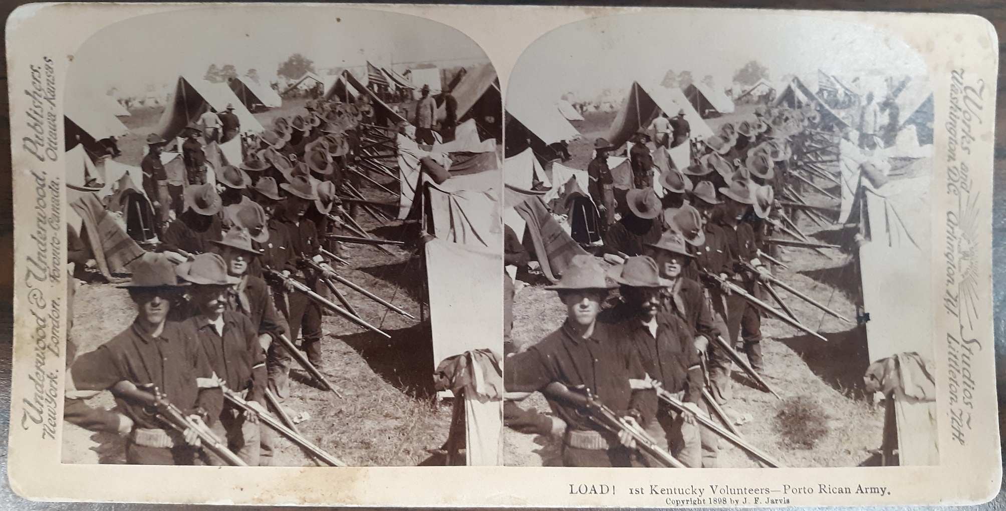 Underwood & Underwood Publishers Stereoview Card by J. F. Jarvis: LOAD! 1st Kentucky Volunteers—Porto Rican Army